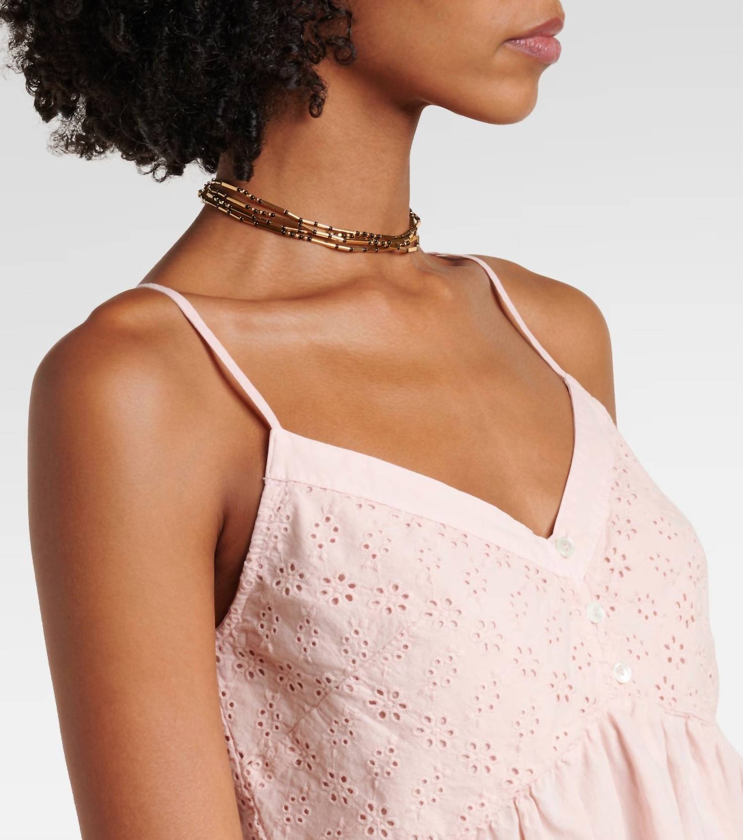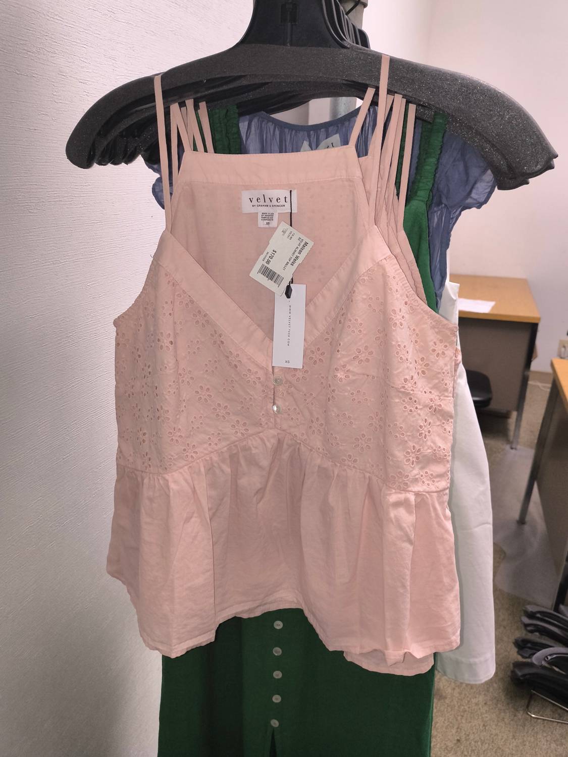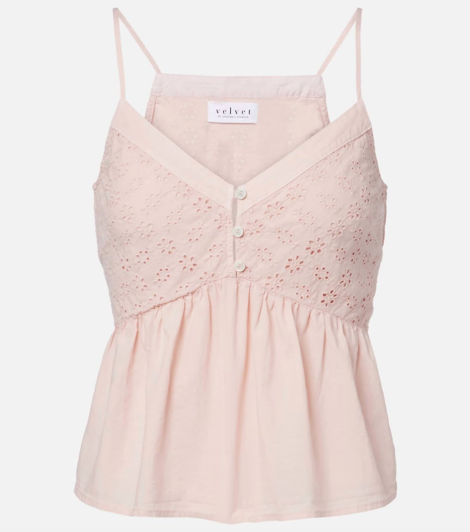 Fit, fabric and functionality. This tank top checks all the boxes. Introducing the Aliah Eyelet Tank Top by Velvet by Graham & Spencer, a Ballet-colored masterpiece perfect for summer gatherings like Thanksgiving. This women's minimalist piece features spaghetti straps and a sweetheart neckline, crafted from breathable cotton poplin with delicate eyelet detailing for a feminine, patterned look. Its tiered silhouette is complemented by a functional three-button front, making it as versatile as it is stylish. Made in the US, this pull-on top is easy to care for with machine wash instructions, ensuring comfort and elegance for your holiday parties.