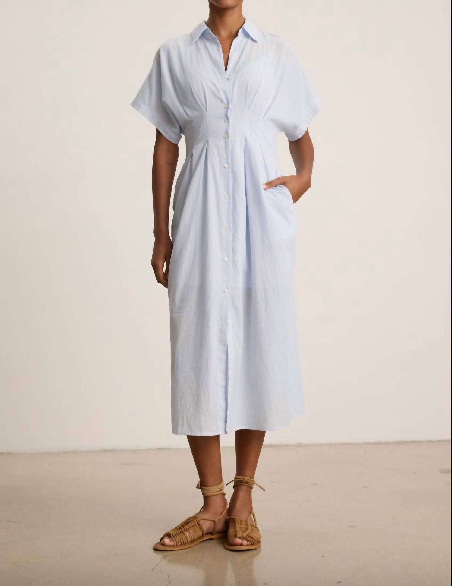 Just add slides or mules and you are good to go. Elevate your summer wardrobe with the Riley Midi Dress by Velvet by Graham & Spencer, perfect for festive occasions like a 4th of July holiday party. This A-line, stripe-patterned dress features short dolman sleeves with banded cuffs, crafted from 100% cotton. Designed with a full button closure and a flattering collar neckline, it also includes pleated details and convenient side seam pockets. Care is a breeze with machine wash and line dry instructions, ensuring it remains a staple in your workwear rotation.