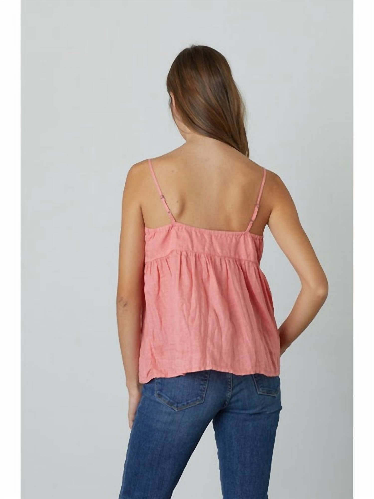 Crafted from a spring-weight linen. Adjustable spaghetti straps. Forms a square neckline. Pull on. Plain color.