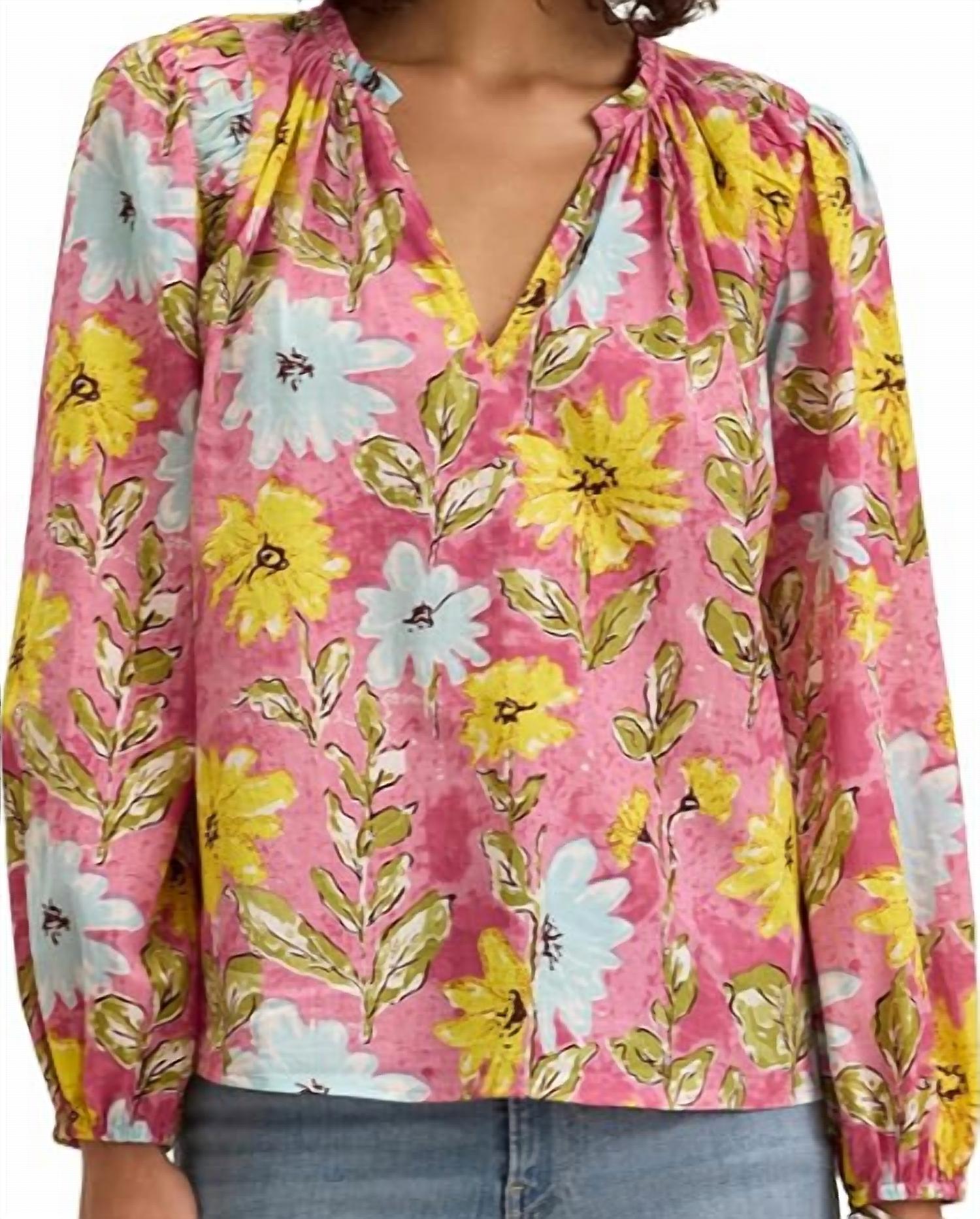 Pair this with your favorite jeans and slides for your next girls night out. Discover the MarySia Blouse by Velvet by Graham & Spencer, a vibrant floral piece perfect for your spring wardrobe. This long-sleeve blouse features a stylish notch neck design and is crafted from 100% cotton, offering comfort and breathability. Country of Origin: Imported. Closure: Pull-on style. Care: Machine wash and lay flat to dry.
