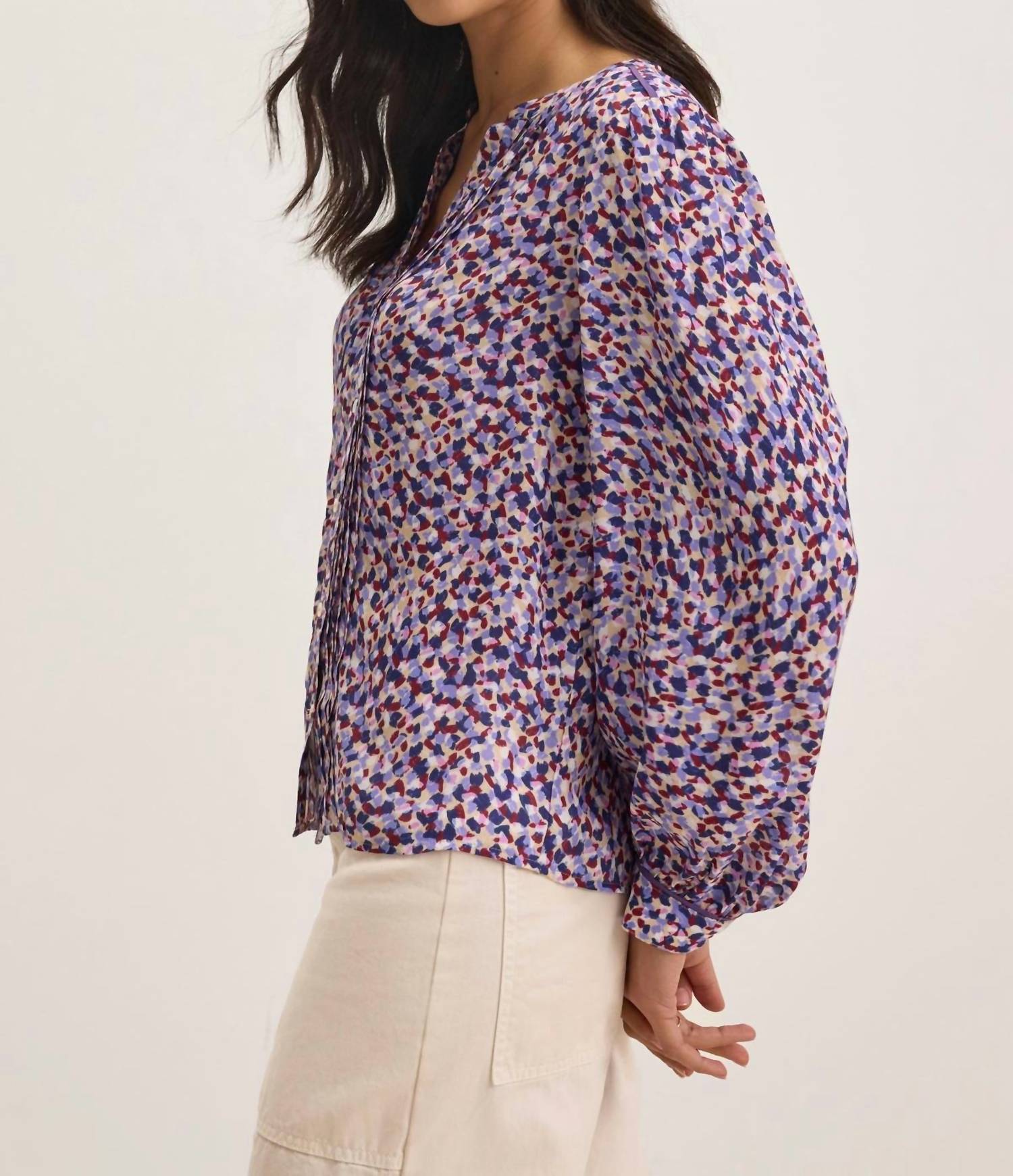 Pair this with your favorite jeans and slides for your next girls night out. Introducing the Elda Long sleeve Blouse by Velvet by Graham & Spencer in a captivating wisteria hue. This women's blouse is crafted from printed royal crepe and features long sleeves, a stylish V-neck, and a button closure for a chic, spring-ready look. The relaxed fit and pleat details on the front add a touch of boho chic to your wardrobe essentials. This patterned piece embraces effortless style, ideal for Easter occasions.