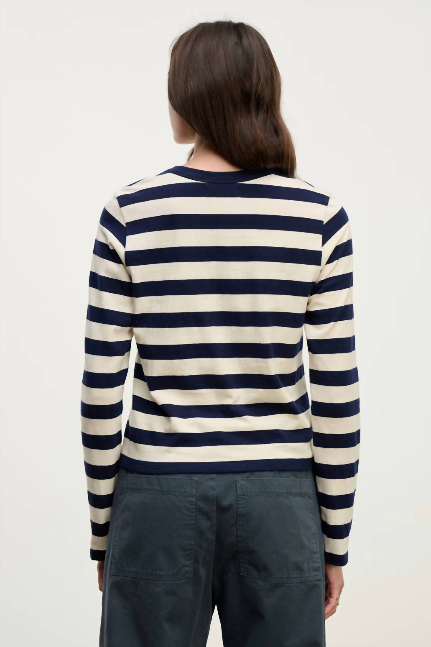 The perfect long sleeve tee that goes with just about anything. Meet the Maya Crewneck Top from Velvet by Graham & Spencer, a chic addition to your Fall wardrobe. This women's navy stripe tee features long sleeves, a crew neckline, and a slightly cropped, boxy silhouette, making it ideal for holiday parties or casual gatherings. Composition: 50% Cotton, 50% Modal. Care: Machine wash and tumble dry for easy maintenance.
