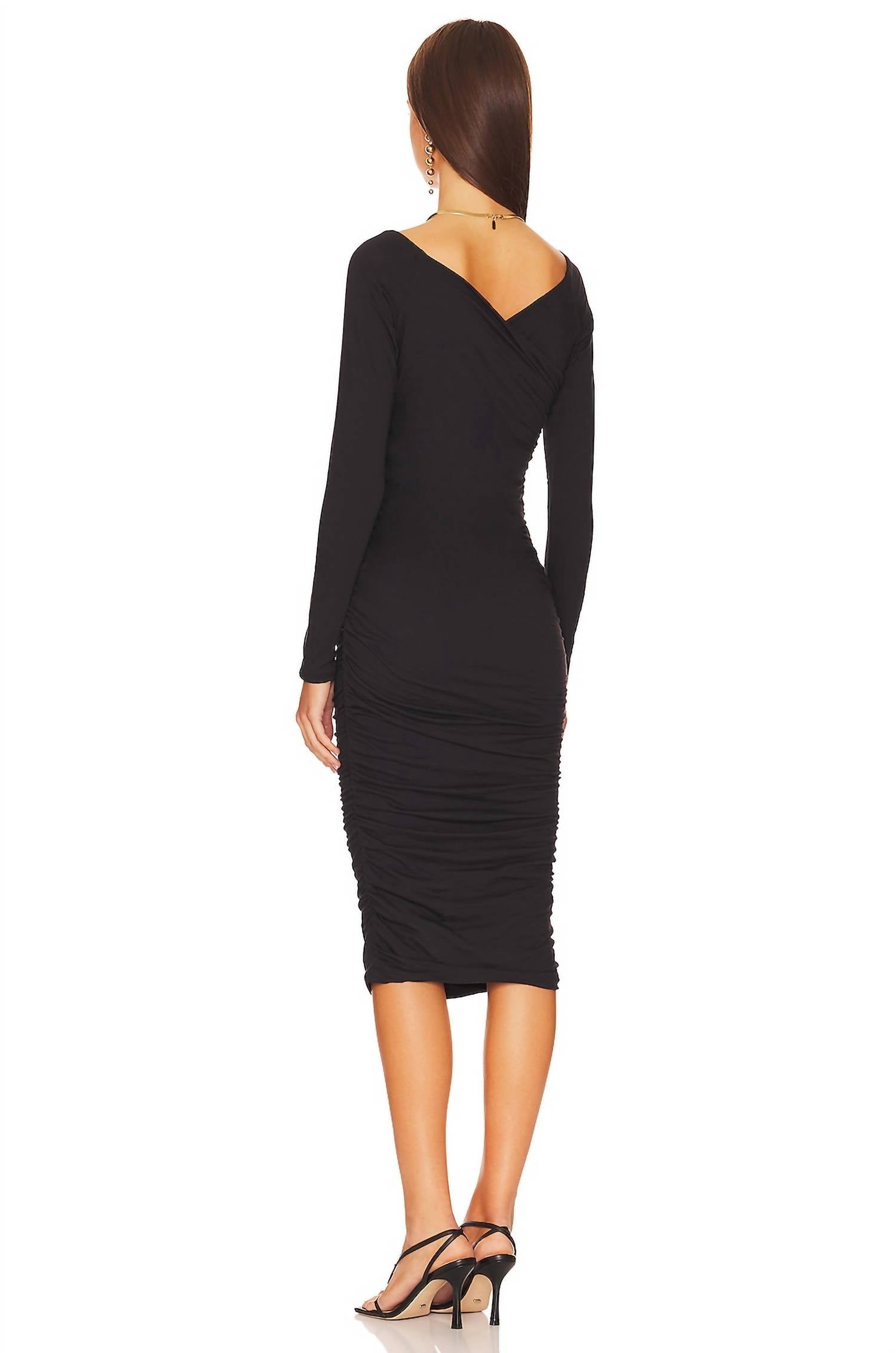 A midi dress so versatile, your options for wearing it are endless. Discover the Tori Dress by Velvet by Graham & Spencer, a minimalist bodycon piece perfect for fall evening events. This dress features long sleeves and a striking V-neck silhouette, designed in a solid black hue for a sleek look. With a comfortable cotton blend composition of 93% cotton and 7% elastane, it offers a figure-flattering 38-inch midi length made in the USA. The pull-on styling is accentuated by ruched detailing throughout, ensuring both style and ease. Care: Machine wash.