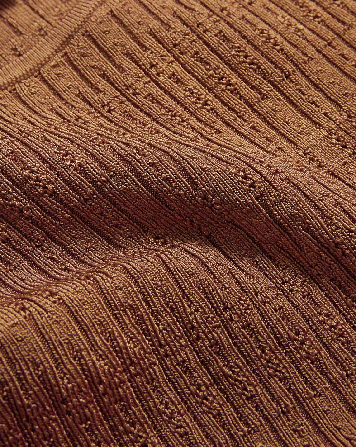 Fit, fabric and functionality. This tank top checks all the boxes. Introducing the Sandra Knit Tank Top by Veronica Beard, a versatile piece perfect for your summer wardrobe. This sleeveless top in a textured sepia brown features a flattering scoop neckline and is crafted from body-skimming 100% Rayon. With a convenient pull-on closure, it promises comfort and style for any vacation or casual occasion. Care Instructions: Dry clean only.