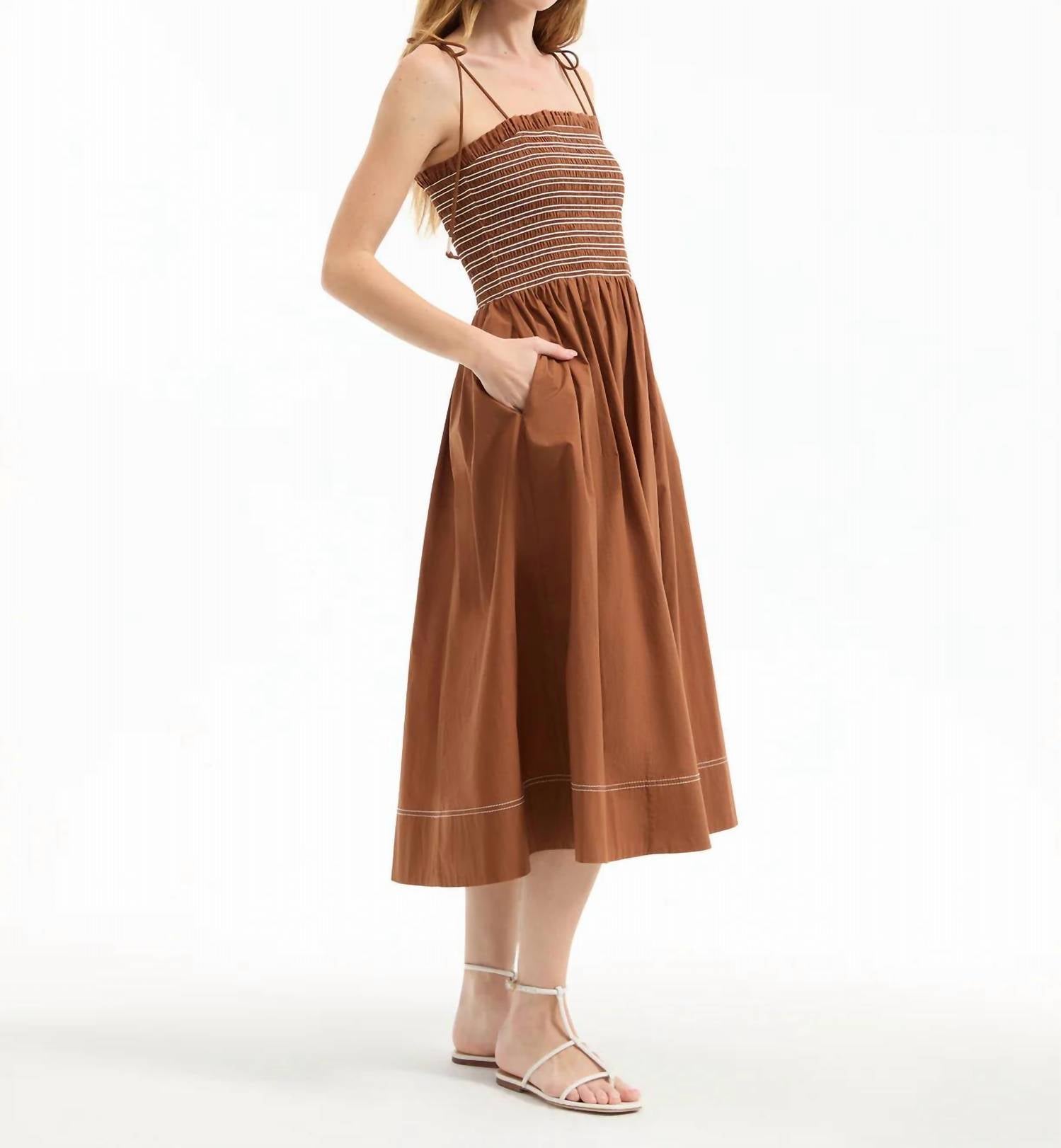 The perfect length dress does exist. Presenting the Kaela Midi Dress by Veronica Beard, an ideal choice for your summer wardrobe. Crafted from soft cotton, this whisky-hued sundress features spaghetti straps and a ruched, elasticated bodice that flows into an A-line silhouette with a breezy circle skirt. Closure: Pull-on style, with convenient pockets. Care: Dry clean only.
