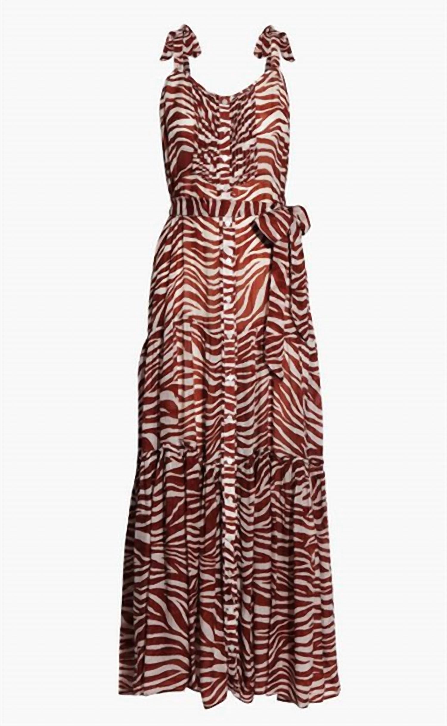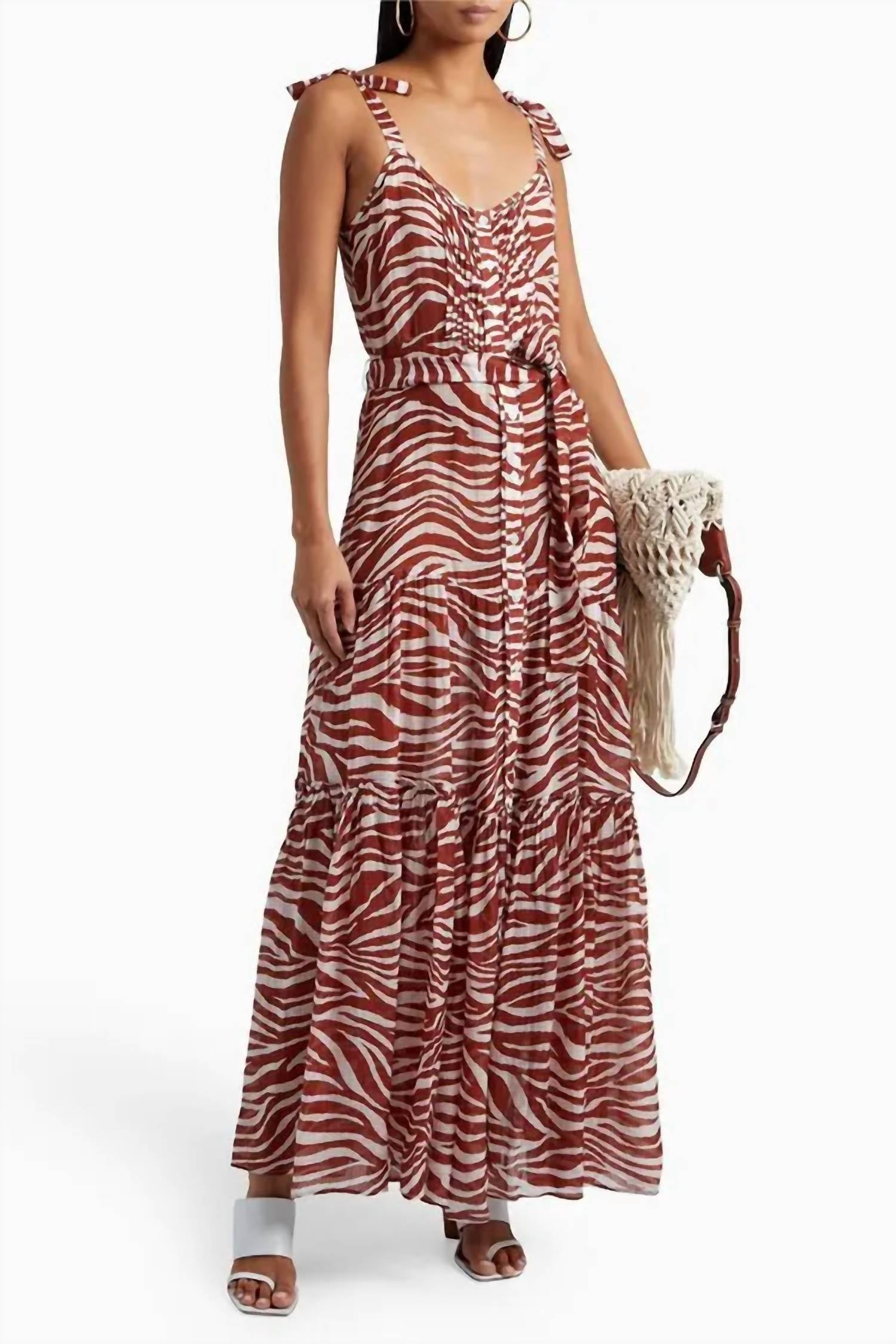 You're go-to coverup for pool parties, beach days and long weekends. This lightweight zebra-print dress is made from 100% viscose jacquard, giving it a soft texture with a subtle sheen. Designed with tiered layers and delicate pintuck details, it features adjustable tie straps at the shoulders and a detachable waist tie for a customizable fit. Button fastenings run down the front, and the non-stretch fabric offers an airy, flowing silhouette. Dry clean only.