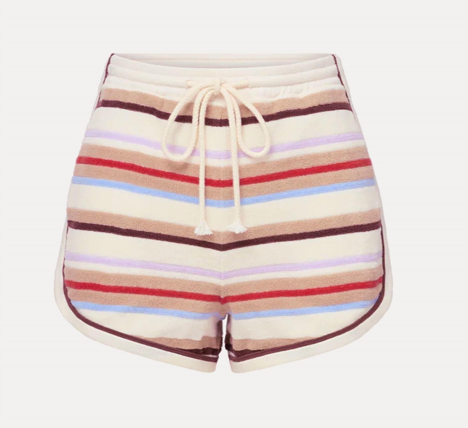 High-waist is here to stay and we especially love this style short. Elevate your spring wardrobe with the Women's Mulberry Short by Veronica Beard, a nod to chic 1970s nostalgia in a khaki multicolor stripe pattern. Crafted from a premium blend of 77% cotton and 23% polyester, this short features an elastic, drawstring closure for ultimate comfort. Designed with a rise of 11.25", a 3" inseam, and a 13" leg opening in size small, these shorts offer both a flattering fit and sporty style. Perfect for vacation wear, these shorts are a versatile high-waist essential for warm-weather occasions.
