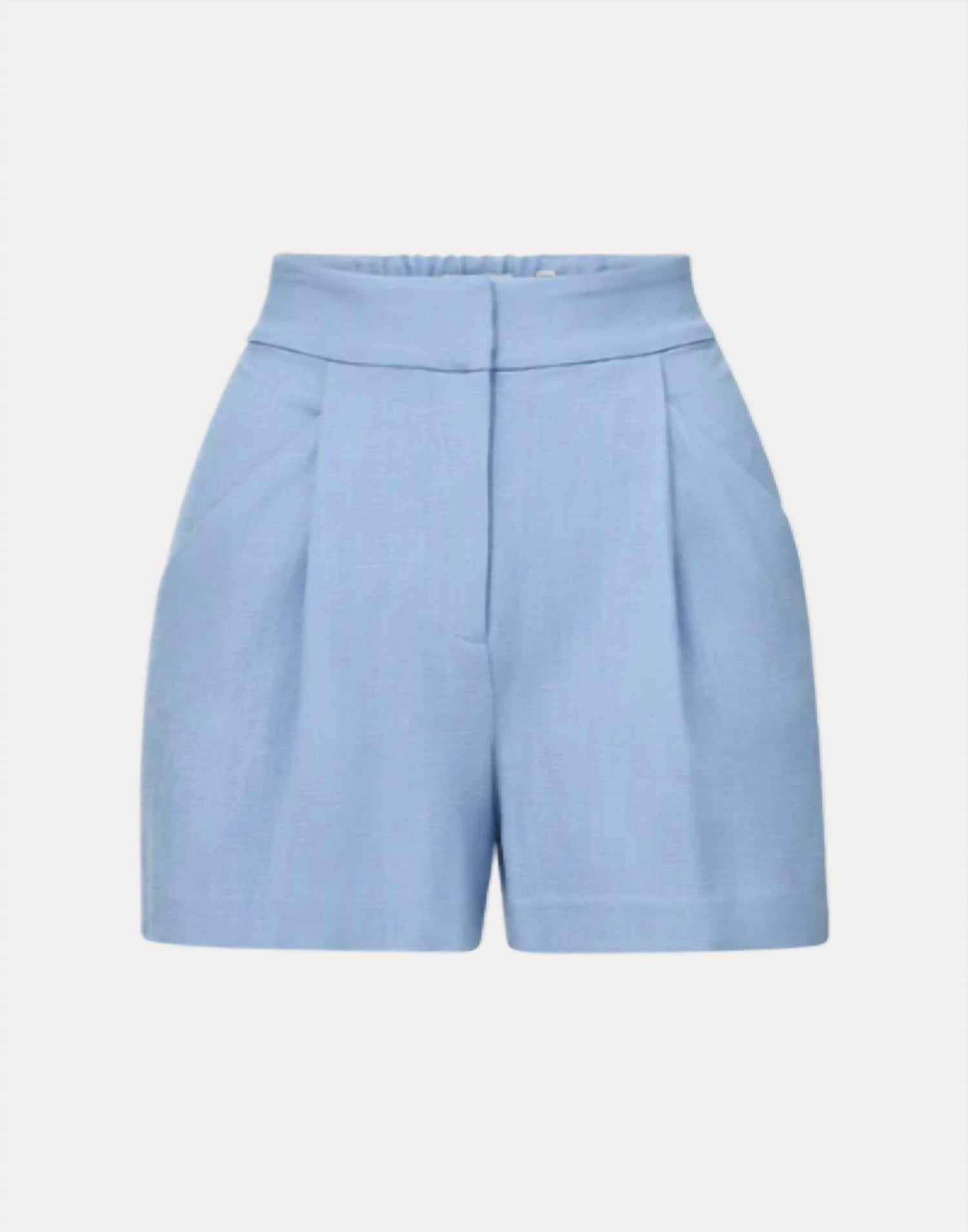 High-waist is here to stay and we especially love this style short. Meet Elbe, the essential tailored short in light blue stretch suiting. Designed with a flattering A-line silhouette, front pleats, and an elasticated waist, it’s finished with side slip and back welt pockets. Pair with a knit or tank for casual ease, or the matching Battista Dickey Jacket for modern spring suiting. 98% Viscose, 2% Elastane. Lining: 100% Polyester. Made in USA. Dry clean only.