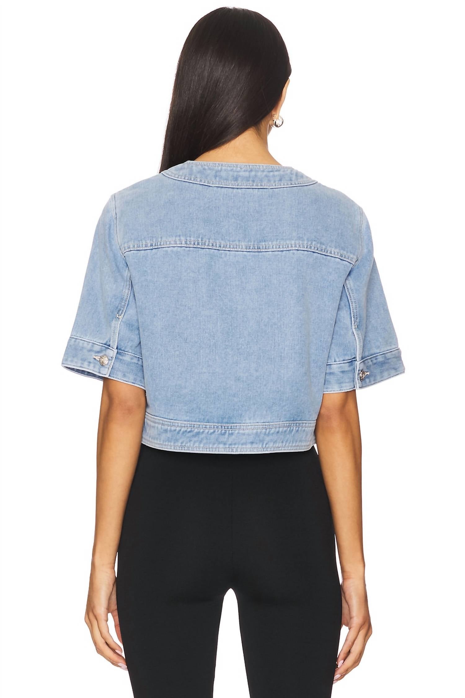 The perfect jean jacket for those slightly crisper days between seasons. Introducing the Elias Short Sleeve Jacket by Veronica Beard, a contemporary twist on the classic denim style in Silverwood Blue. Tailored in 100% Cotton, this jacket features a cropped, boxy silhouette and roomy short sleeves for a modern fit. Designed with two oversized front flap pockets and finished with signature decorative crest buttons, it offers both style and functionality. Care: Machine wash cold with like colors. Sleeve Length and Garment Length: 19", based on a size S. Model is 5'9" and wears a size S.