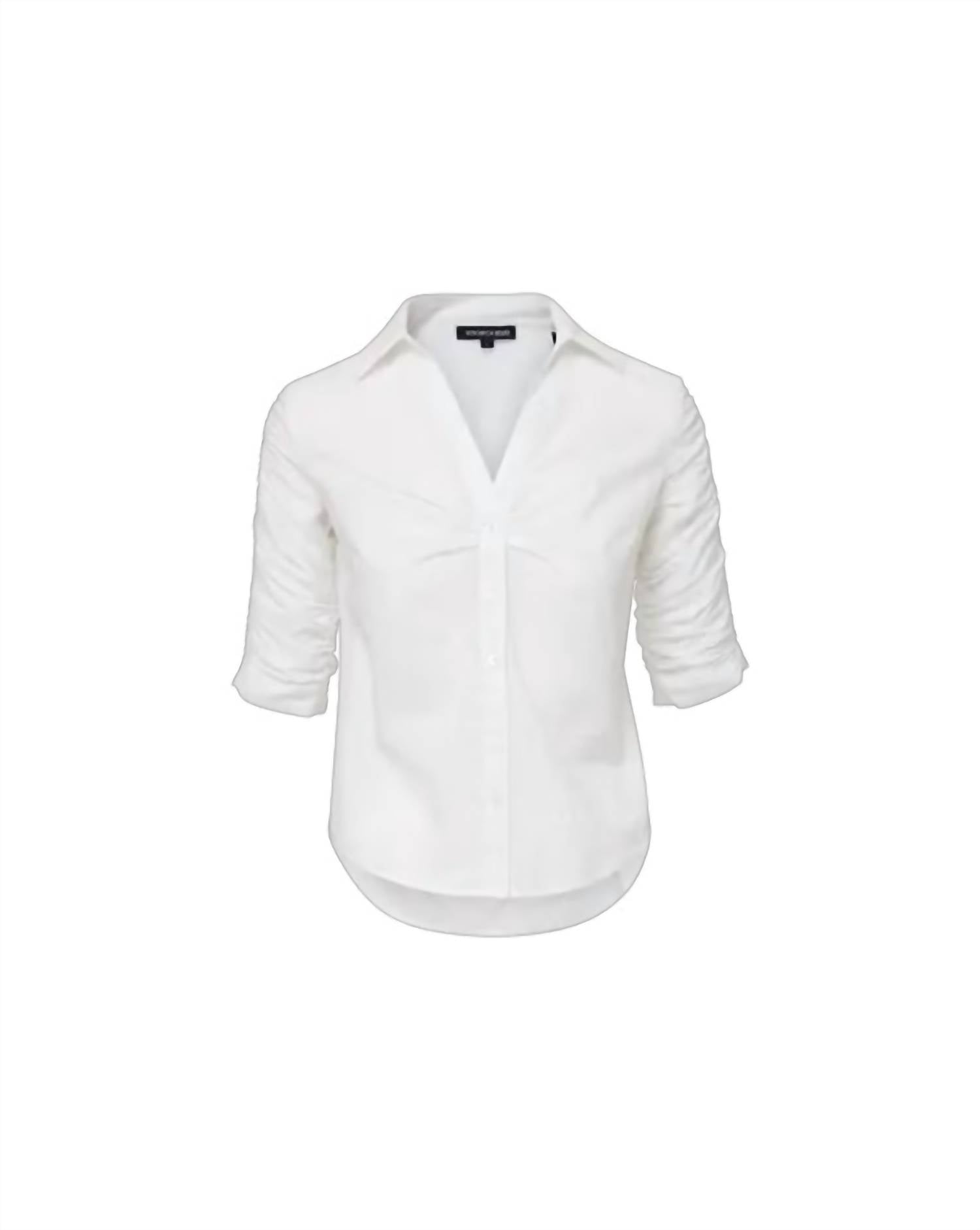 Perfectly tailored and soft to the touch. The Porta Button Down Shirt by Veronica Beard is a sophisticated embodiment of femininity with its crisp white cotton composition. This shirt features stylish elbow sleeves with a ruched design and a gathering at the front, all elegantly complemented by a classic collar and a split V neckline. Its polished button closure ensures a versatile fit, ideal for any occasion from springtime soirees to casual dinners. For optimal care, dry clean only.