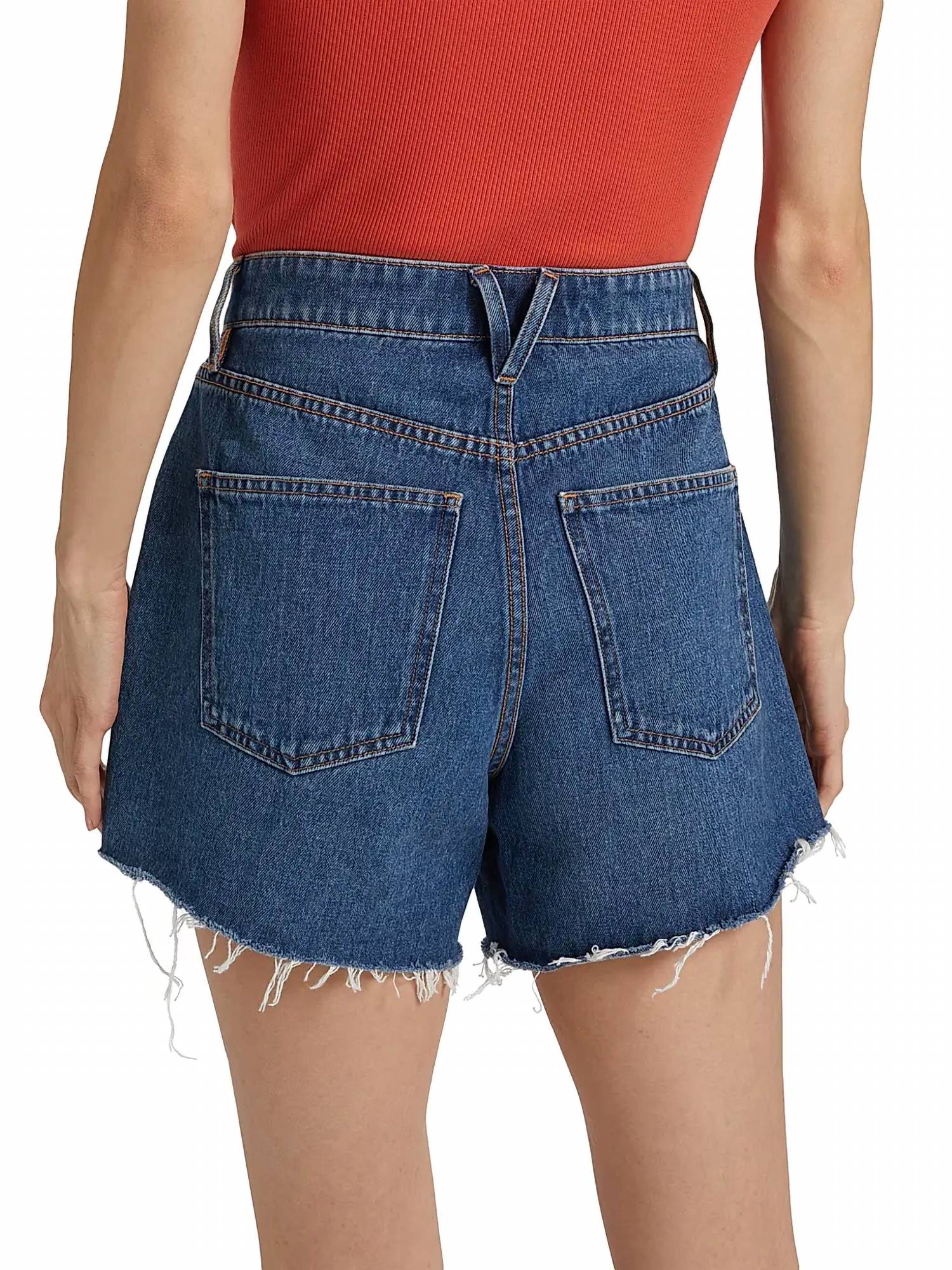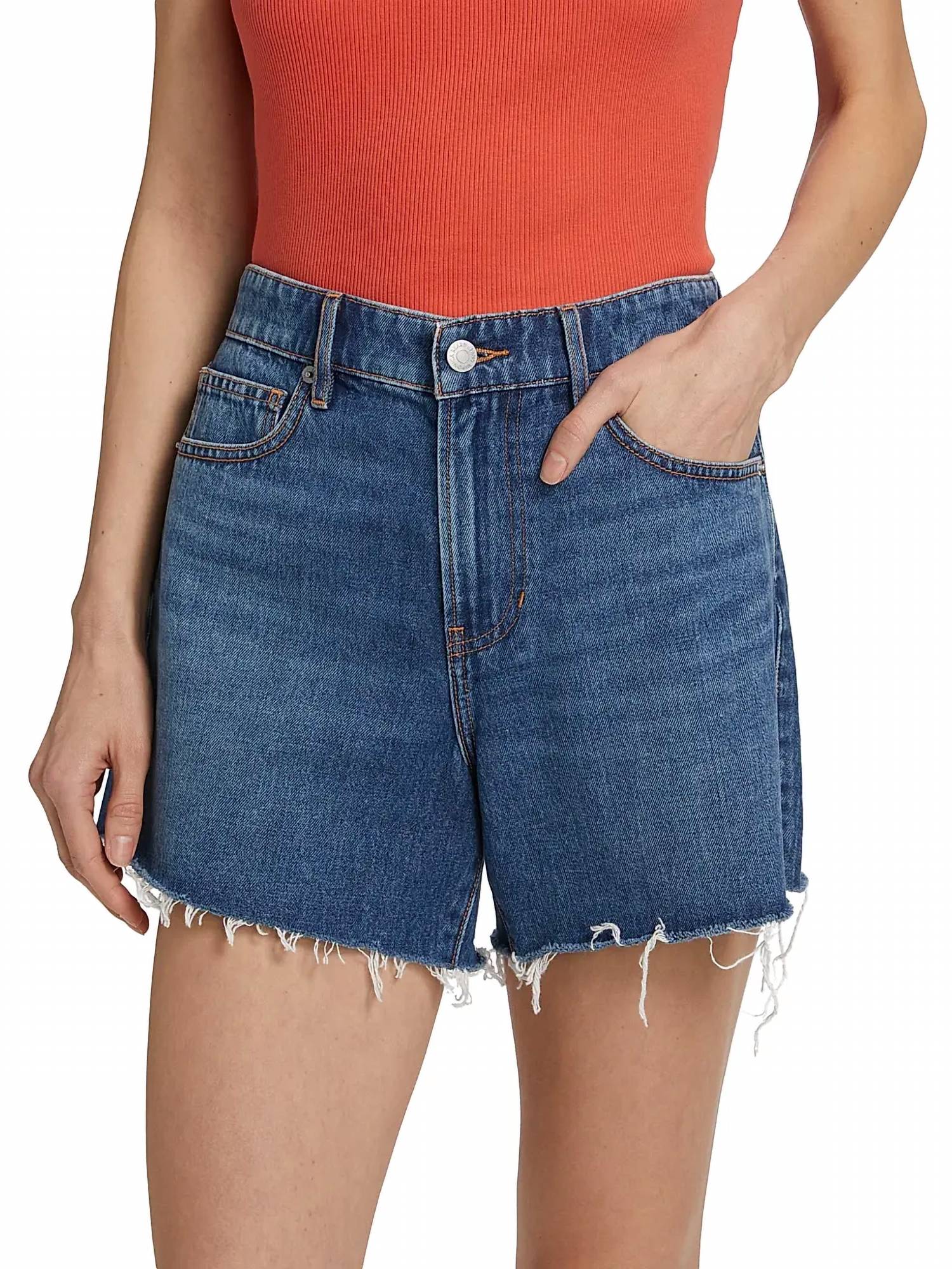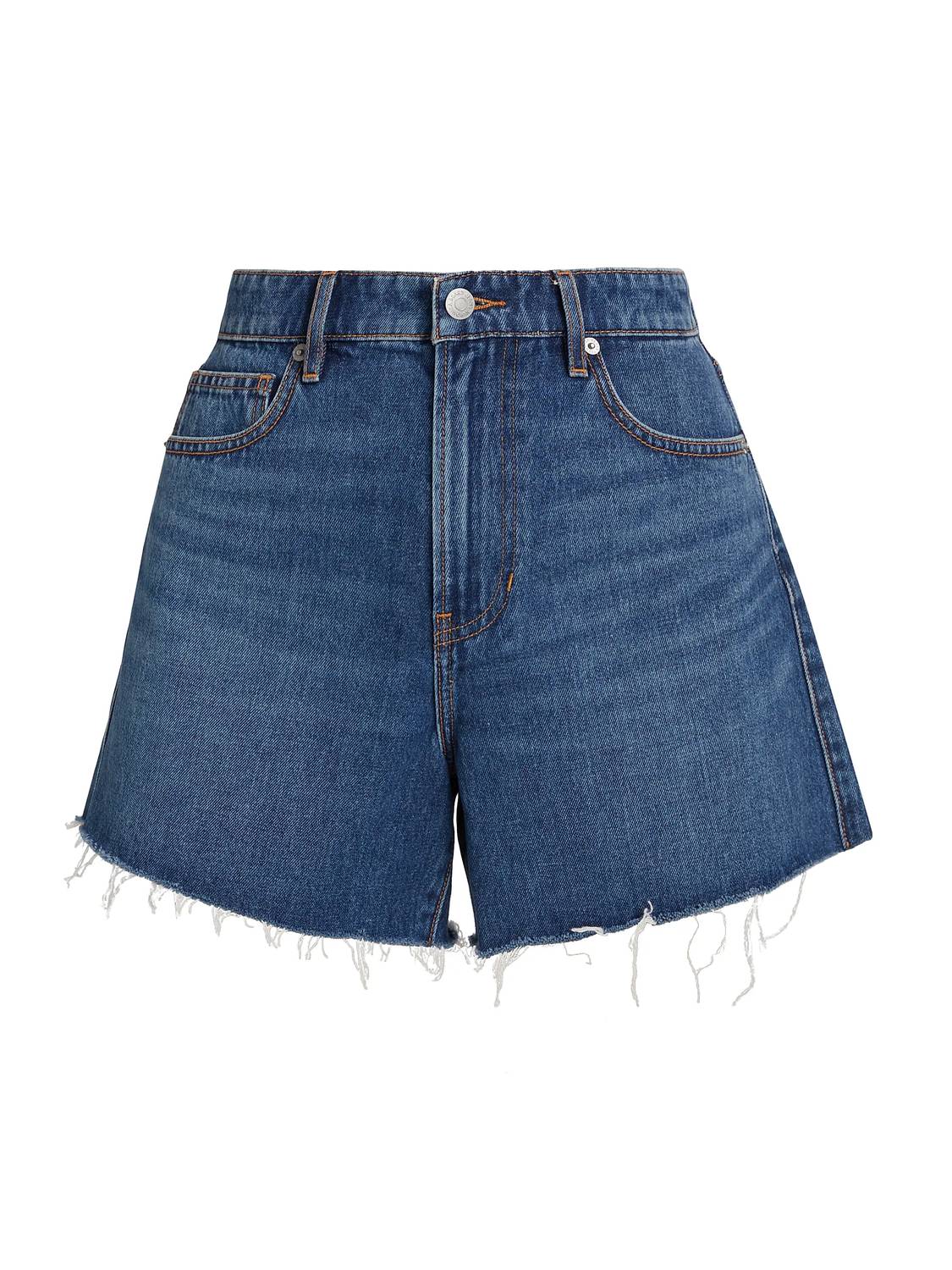 You can never have too many jean shorts and these will be your new favorites. Elevate your wardrobe with the Ellis Mid Rise Denim Shorts by Veronica Beard, perfect for spring and travel occasions. These shorts come in a stoned bright blue and feature a five-pocket design, adding both style and functionality. Crafted from 100% cotton denim, they boast a relaxed fit with raw-cut hems, a button closure, and zip fly for a trendy 90s fashion look. Made for easy care, these shorts are machine washable and can be tumble dried. With a rise of about 11 inches, an inseam of 5 inches, and a leg opening of approximately 24.5 inches, they offer an ideal fit for warmer days. Model is wearing a US size 4 and stands 5'10" tall.