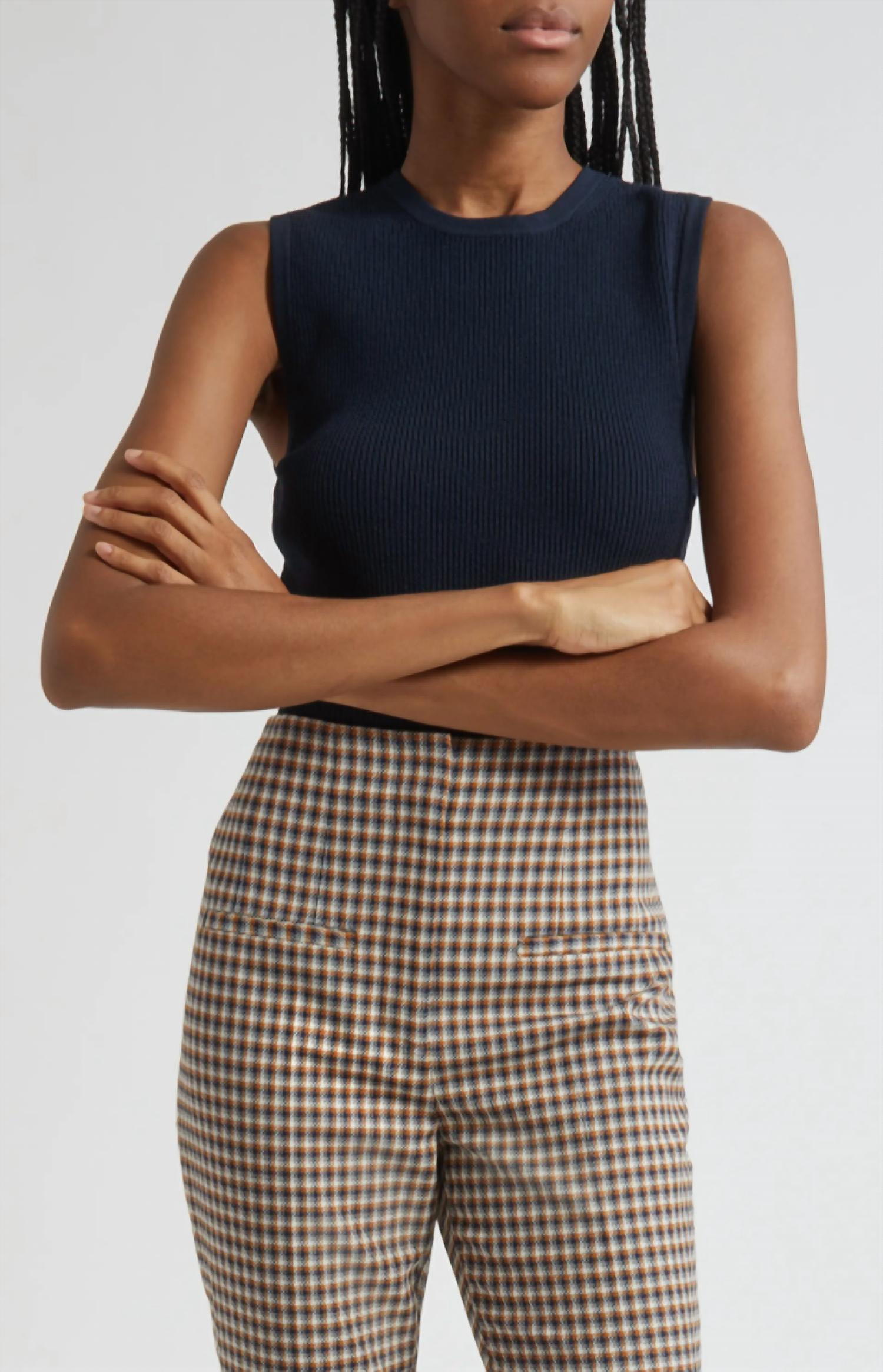 This classic tank top is perfect for layering and cute enough to wear on its own. The Veronica Beard Crewneck Sid Sleeveless Pullover in navy is a minimalist essential for any wardrobe. With a sleeveless design, this tank top is crafted from a luxurious blend of 51% viscose, 34% nylon, 12% polyester, and 3% elastane, ensuring a comfortable and ribbed-to-fit style. It features a pull-on closure for ease and is perfect for layering or standalone wear during spring events like holiday parties. Country of origin: Imported. Care: Dry clean only.