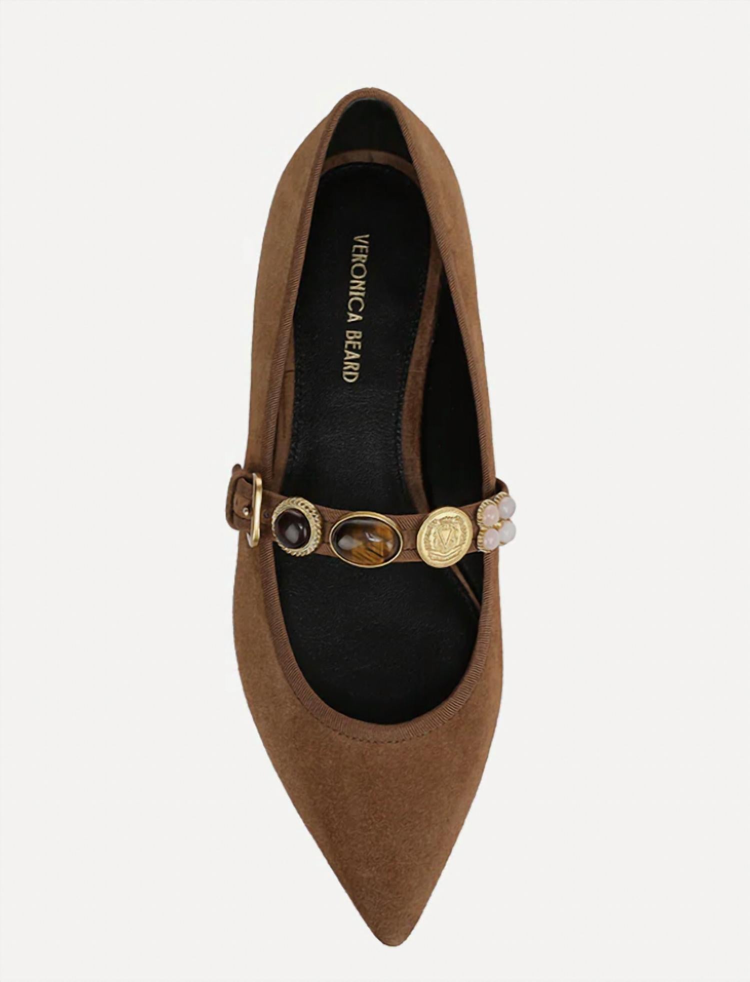 A classic loafer that is both comfortable and polished. Introducing the Women's Selene Embellished Flat by Veronica Beard, a sophisticated choice in the enchanting hue of Hazelwood. These flats are crafted with a pointed toe and maintain a sleek, flat heel height of 1 inch and under, perfect for all-day wear. Designed for medium shoe widths, these versatile flats seamlessly blend comfort and style. The sleek design adds a touch of elegance, making them ideal for any occasion.