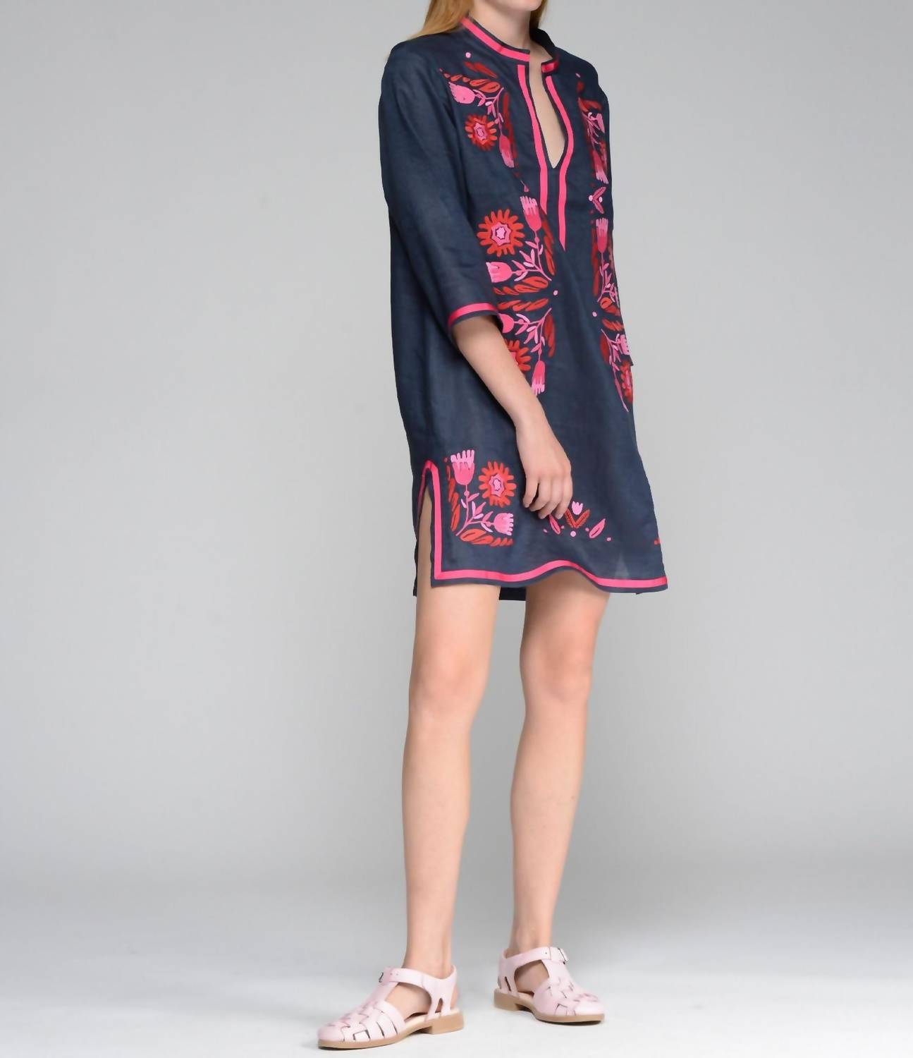 Comfortable and cute, this casual day dress has it all. Introducing the Caftan Style Dress With Pink Floral Design by Vilagallo, a versatile addition to your wardrobe for day-to-evening elegance. This navy dress showcases a stunning pink floral embroidery, embodying a boho chic vibe. With a casual shift silhouette and a flattering V-neck, it features three-quarter sleeves for year-round wearability. Crafted from 100% linen, this pull-on dress is easy to care for with machine wash and line dry instructions, making it perfect for vacations and spring and summer events.