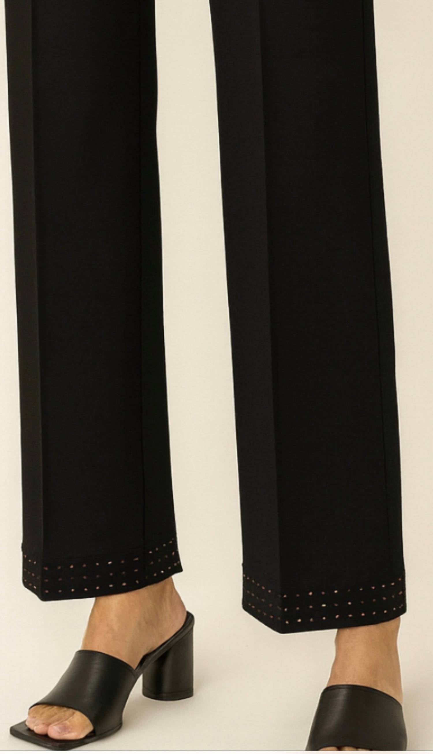 This straightleg pant is both stylish and comfortable. Did we mention the fit is perfection? Step out with confidence in the Women's With Rhinestone Trim Pants by Vilagallo, perfect for making a bold statement. These black, solid-pattern, straight-leg pants offer a slim fit with a high-rise waist for a sleek silhouette. The rhinestone trim at the hem adds a touch of sparkle, ideal for engagement parties or Easter celebrations. Featuring a zip closure, these pants capture the essence of edgy workwear.