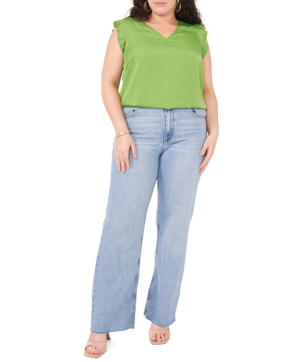 A timeless blouse that will never go out of style. Introducing the V Neck Short Sleeve Top by Vince Camuto in the vibrant Salted Lime hue, perfect for your summer wardrobe. Featuring charming pleated cap sleeves and a flattering V-neckline, this top is crafted from 100% polyester for a relaxed silhouette. Closure: Pull on. Ideal for versatile styling, it's the go-to piece for an elevated weekend look.