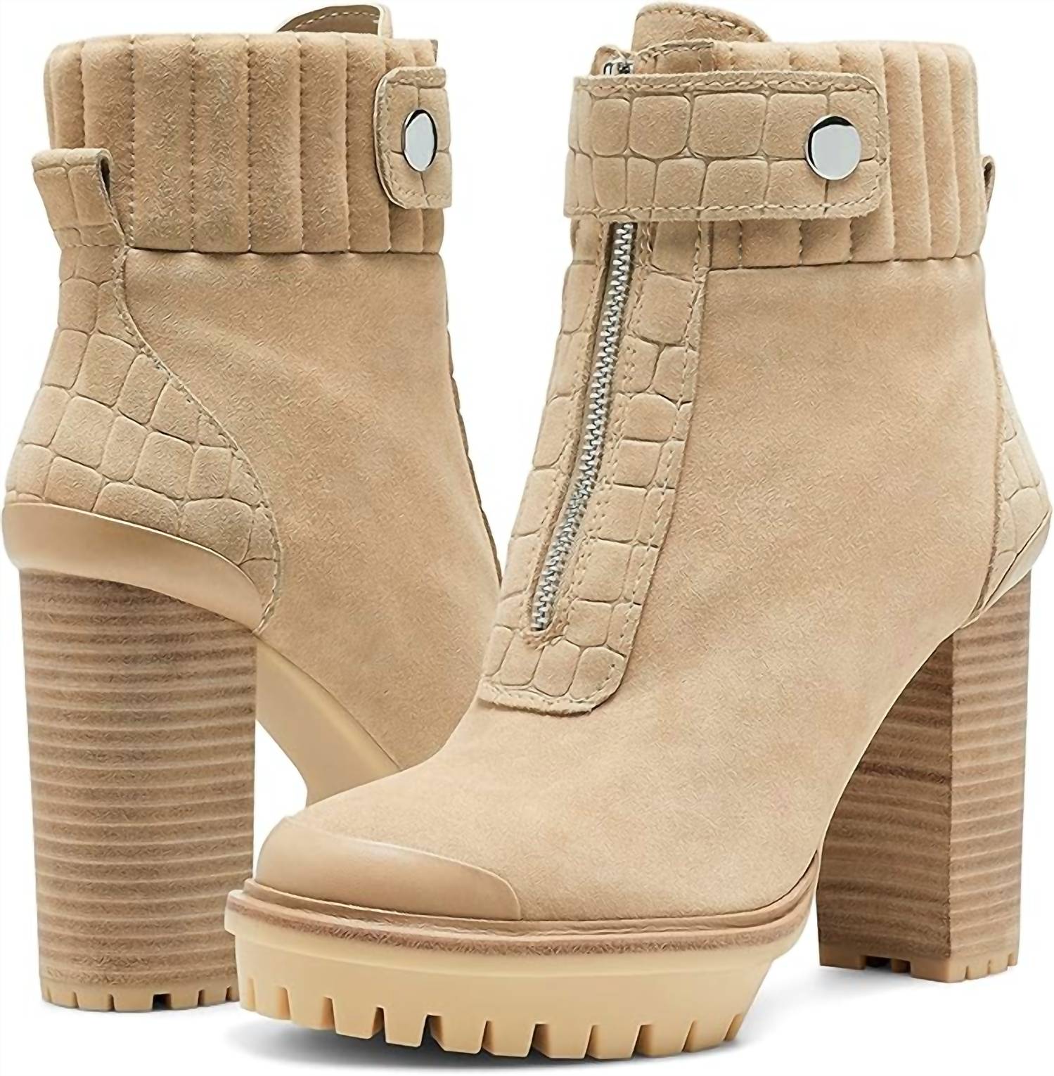 Say hello to the perfect, most versatile boot. The ankle height makes this style easily transition from day to night. Wear them with your favorite skinny jeans and tee for a more laid back look, or pair them with your favorite mini dress and jacket for a night out on the town. Introducing the Women Renee Bootie by Vince Camuto, a stylish hiking boot that combines fashion with functionality in a beautiful Tortilla hue. These boots feature a sleek zip-up closure with croc-embossed accents and a quilted collar, complemented by a partial snap belt for added flair. Crafted from luxurious leather, they boast a comfy round toe and a sturdy 4.25” block heel with a 1” platform, making them perfect for pairing with denim or tights. A must-have for those looking to elevate their ensemble, these boots are ideal for all-day wear.