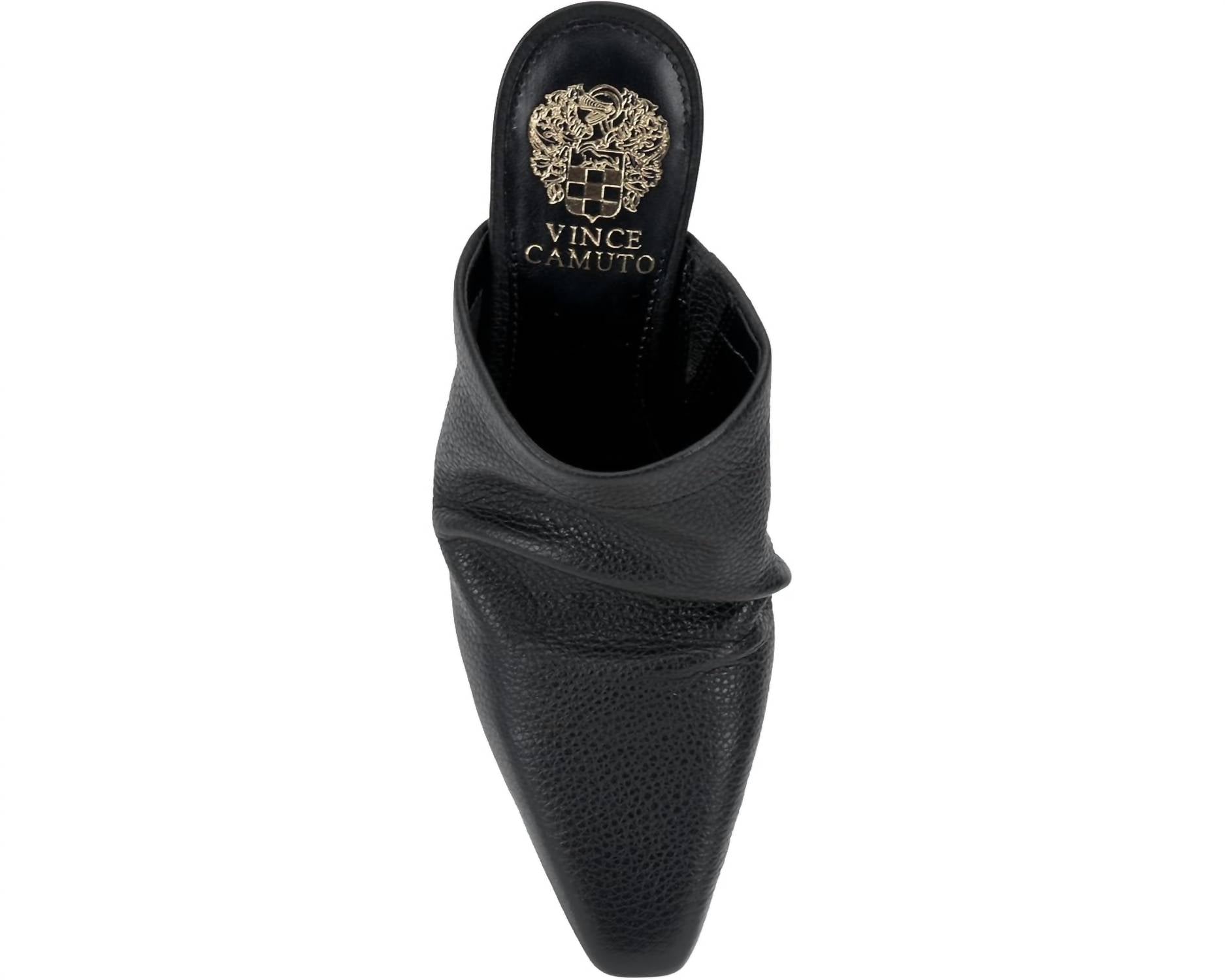 A trend that everyone is loving and this style might just be our favorite. Step into elegance with the Women's Carlie Mule by VINCE CAMUTO, boasting a sophisticated snip toe design that naturally ruches atop the foot for a chic effect. This black mule features a leather upper complemented by a polyester lining and a cushioned faux leather insole for superior comfort. The slip-on style is enhanced with a rubber outsole, padded sock, and an elastic gore for improved fit, all balanced on a stylish block heel with a height of 2.75 inches. Ideal for a polished yet comfortable look, perfect for the modern woman.