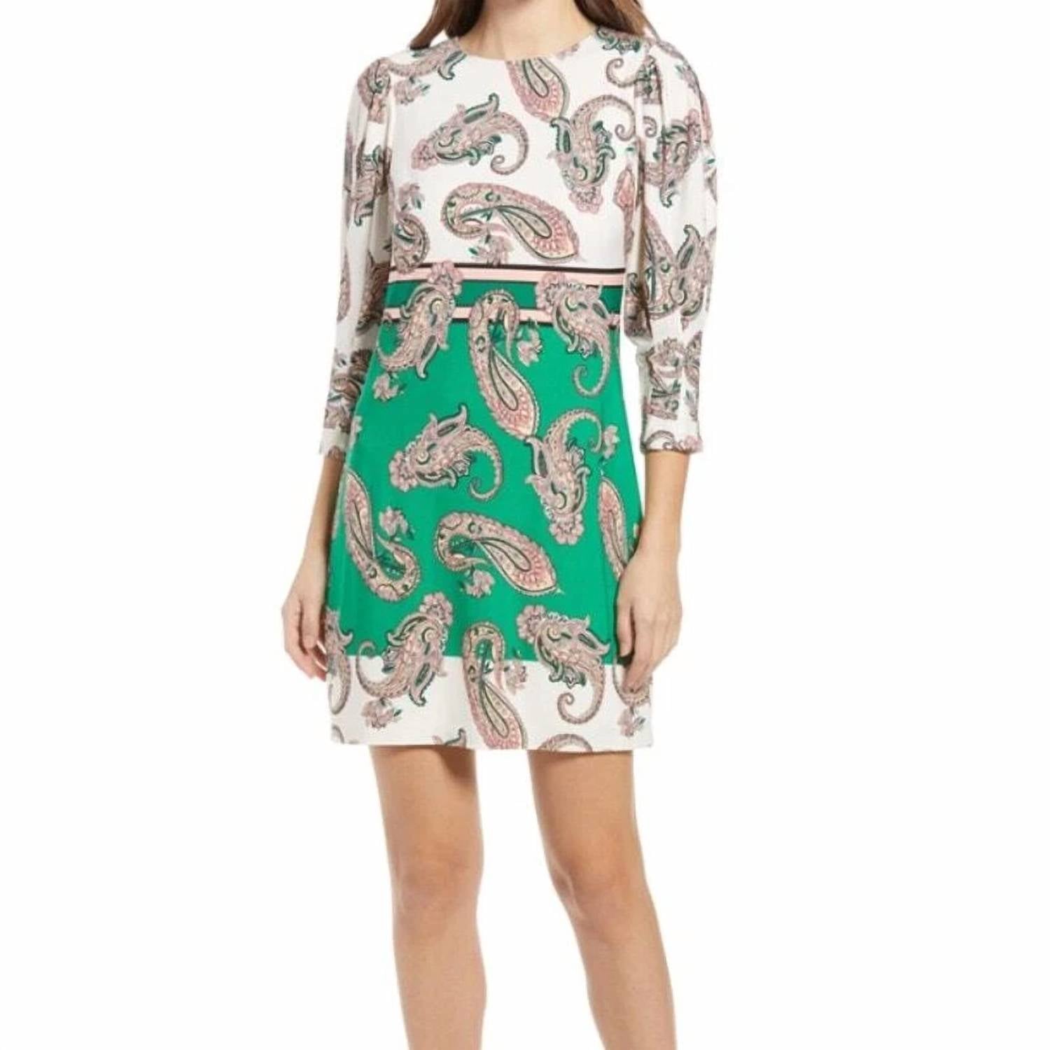 The pefect long sleeve dress for those cooler months. The Paisley Mix Long Sleeve Dress by VINCE CAMUTO brings a modern twist to a classic with its vibrant color-blocked paisley print in a stunning green hue. Featuring long sleeves and a flattering 36" length, the dress is made from a blend of 95% polyester and 5% spandex for a comfortable fit. The hidden back zip closure adds a sleek finish, while the dress is partially lined for ease of wear. Care instructions include machine wash for convenient maintenance.
