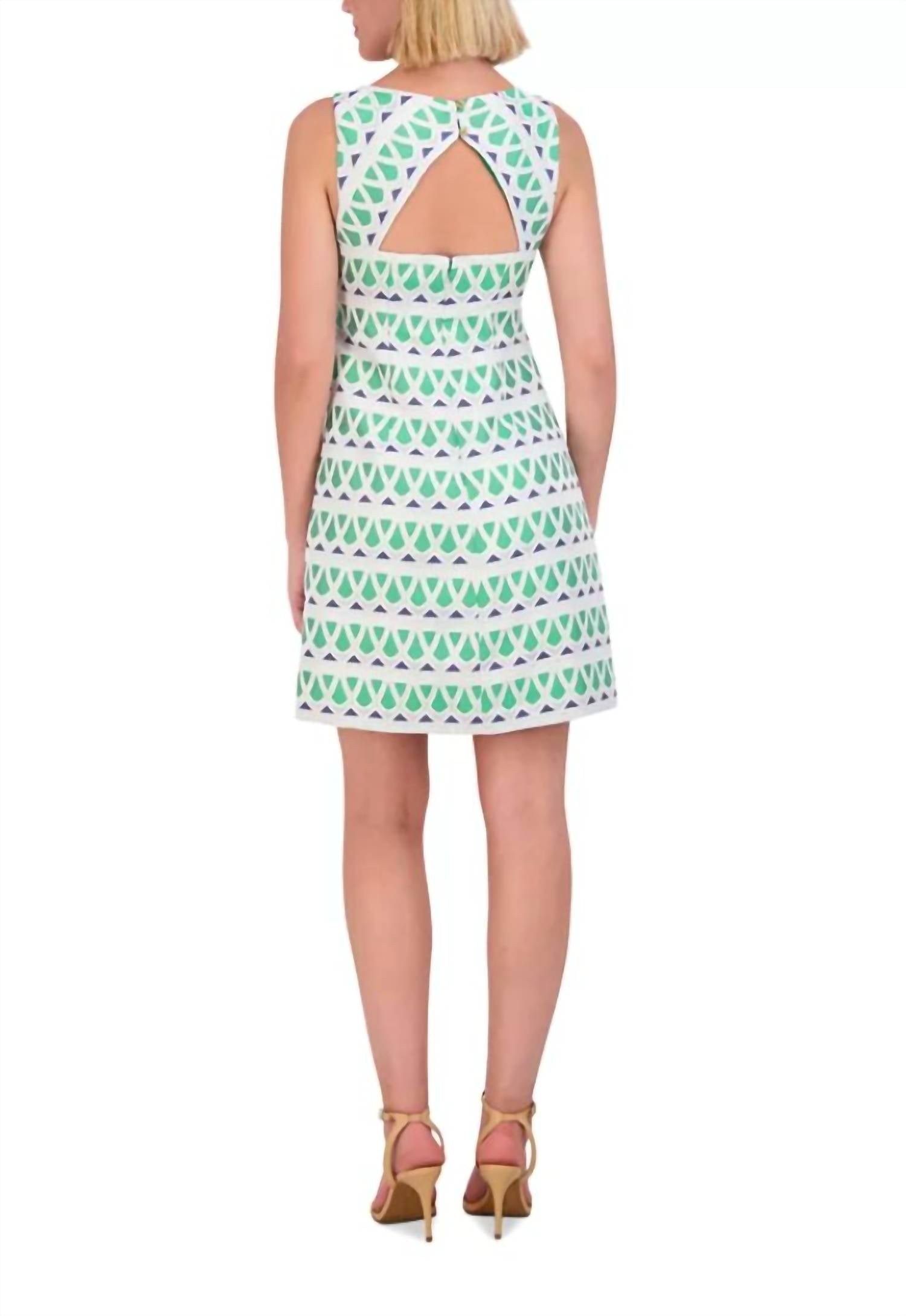 The perfect mini dress for those warmer months. Adorable green, blue, white patterned sleeveless cocktail dress with boatneckline and open keyhole back with 2 gold buttons. Lined with back zipper closure.