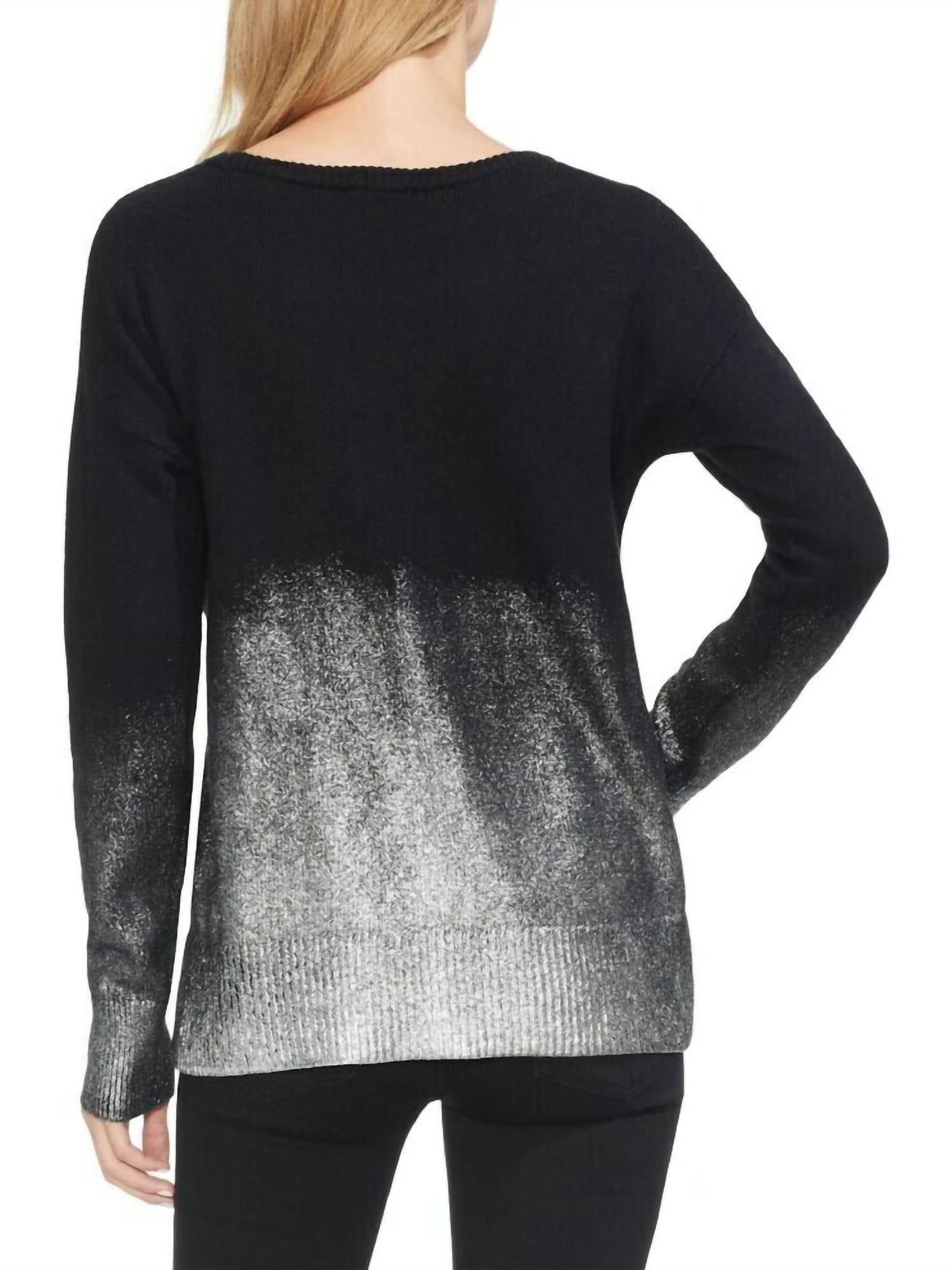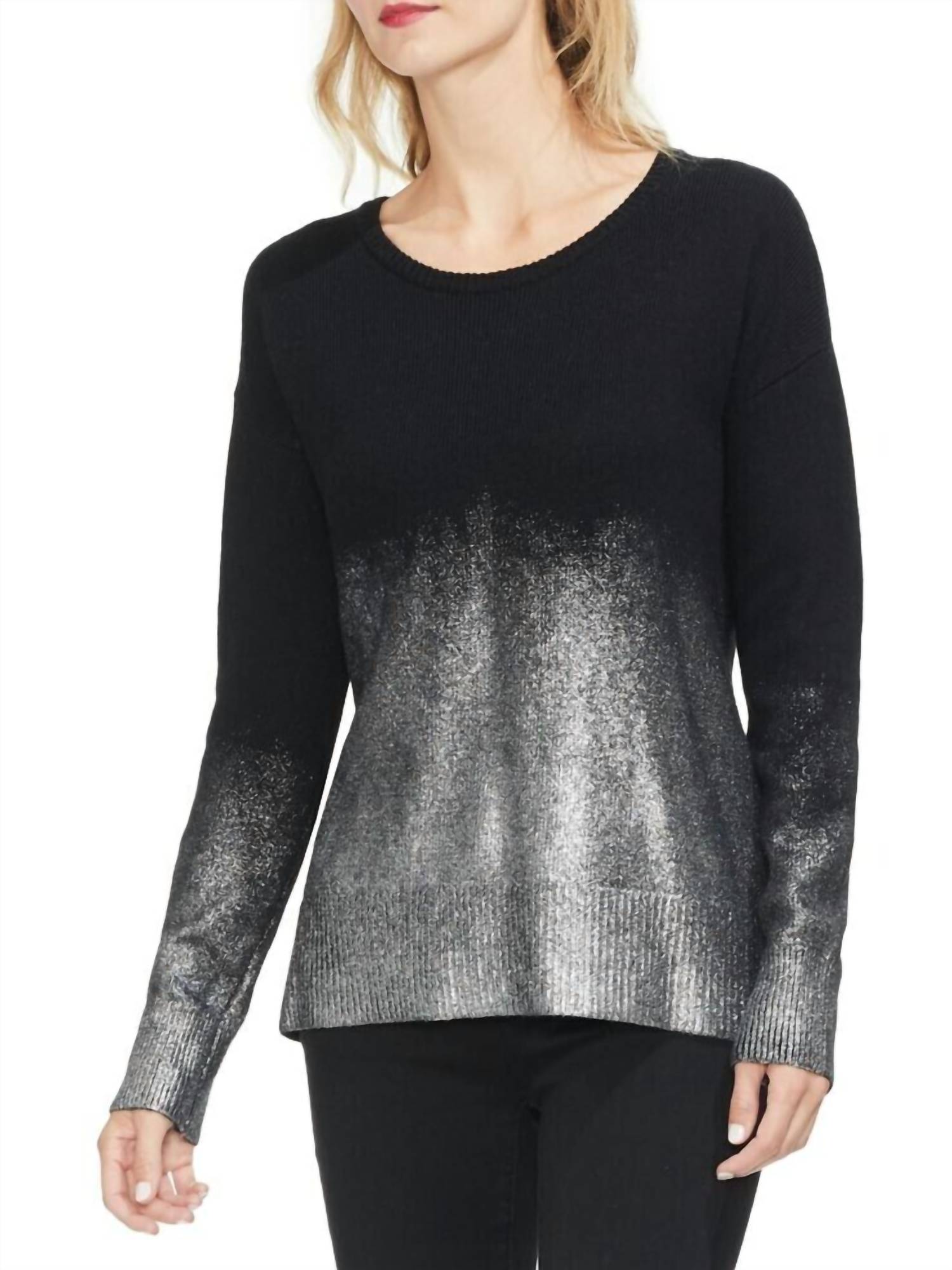 Elevate your casual wardrobe with the VINCE CAMUTO Ombre Foil Pullover Sweater. This long sleeve piece showcases a stylish ombre pattern and is crafted from a 57% Cotton, 28% Acrylic, and 15% Polyester blend that ensures medium weight warmth for all seasons. The knit construction and casual modern fit, coupled with ribbed details on the collar, cuffs, and hem, make it a versatile addition. The sweater features a classic crewneck and a convenient pull-on closure, perfect for effortless style.