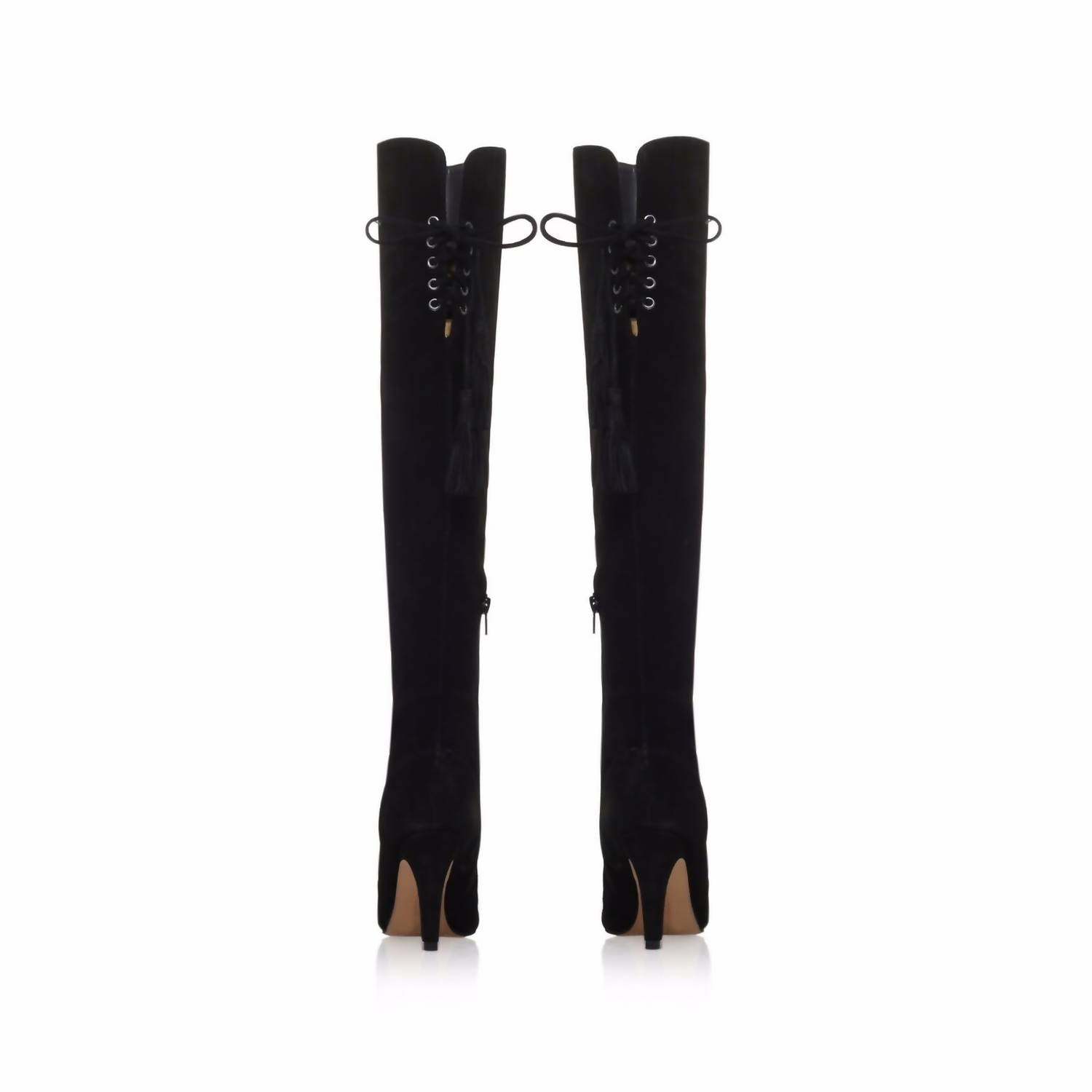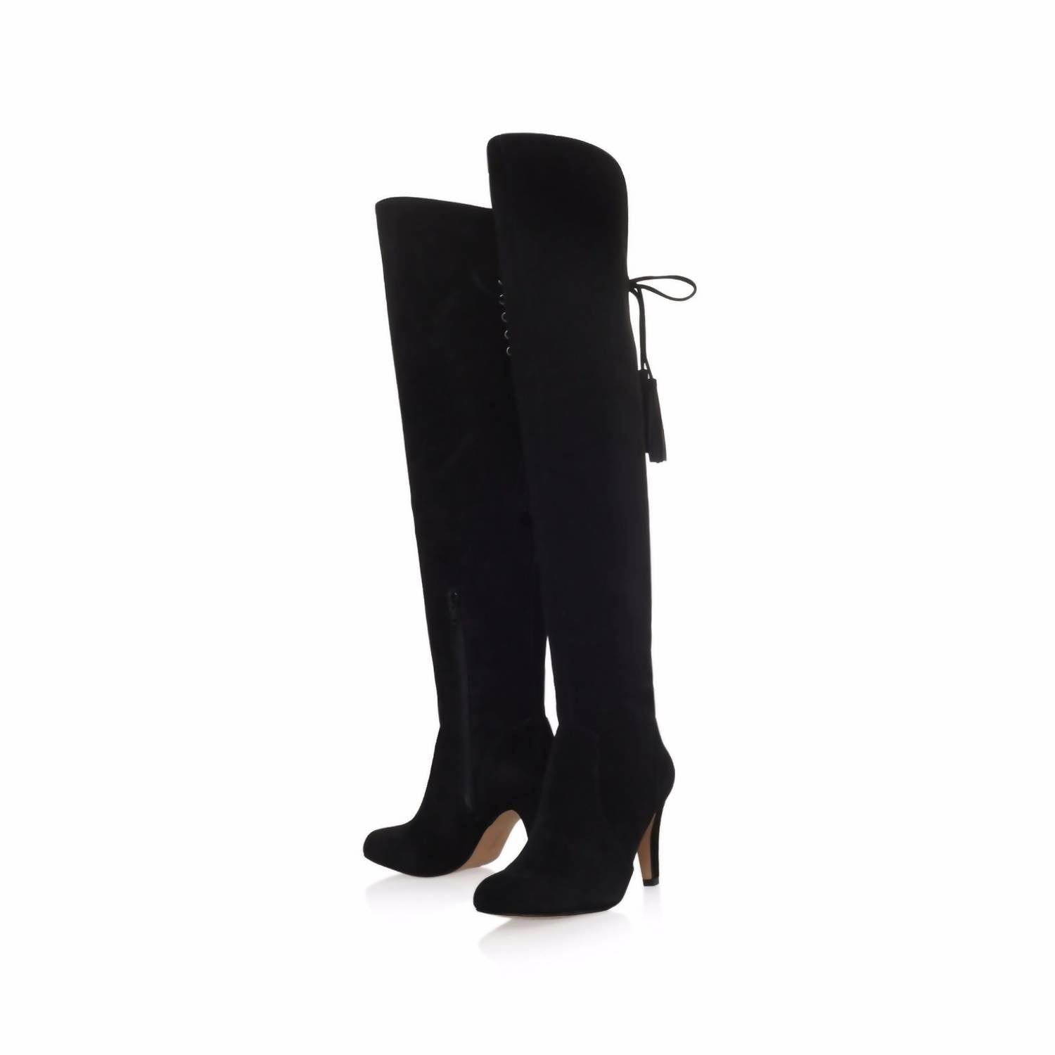 These over the knee boots are equal parts classic and cool. Feel suave in the fashion forward Cherline knee-high boot. Suede leather upper. Pull-on wear with rear tie tassel closure Man-made lining and insole Lightly-padded footbed Wrapped heel Heel Height: 3" Shaft height 18.5"