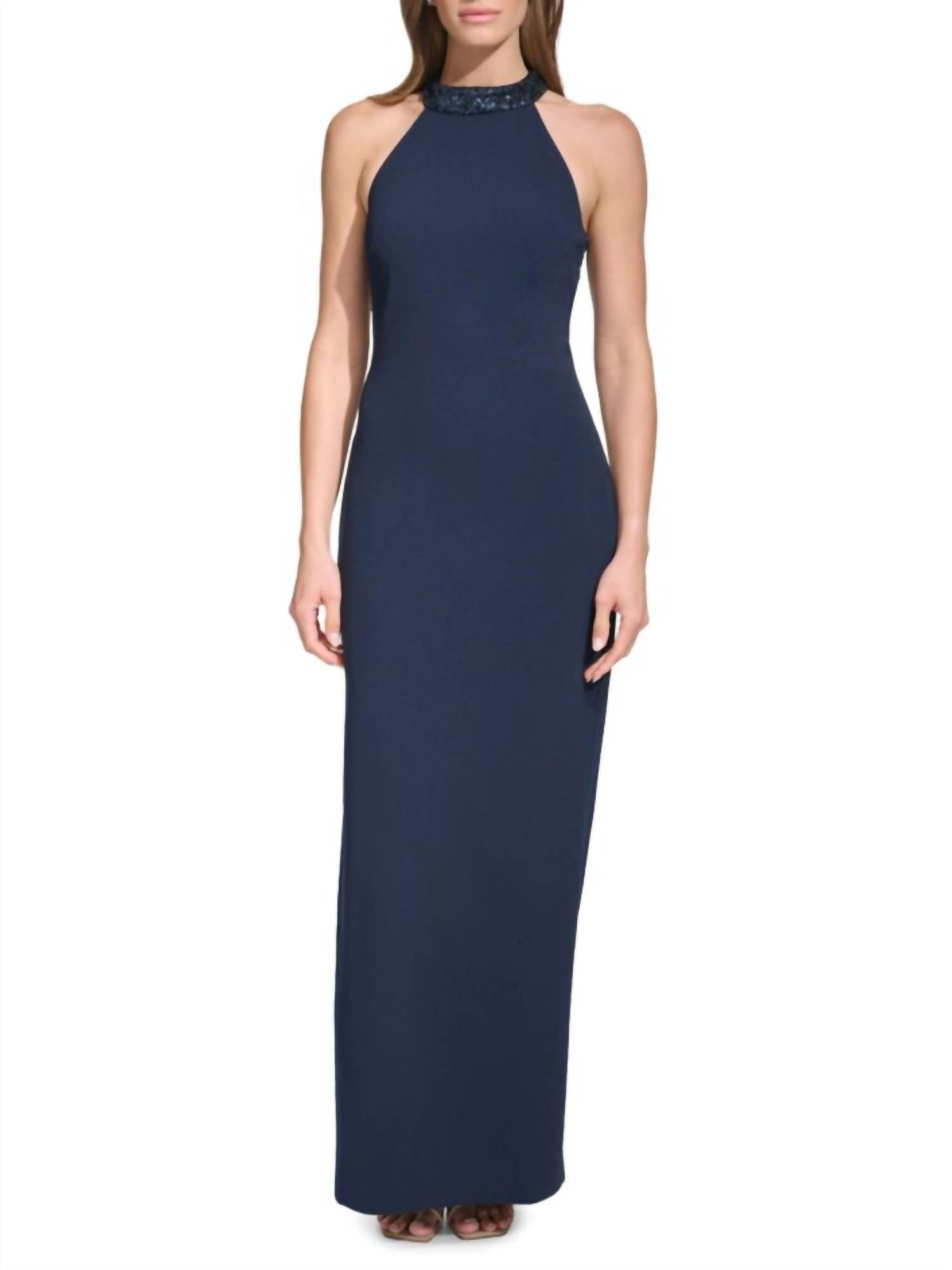 Style this maxi with your favorite statement necklace and sandals for the perfect look. Introducing the High Neck Navy Dress by Vince Camuto, a striking gown perfect for a dinner party. This sleeveless dress showcases a jewel neckline with elegant sequin details and a stylish cutout back. Crafted from 94% polyester and 6% spandex, it offers a sleek column silhouette that measures approximately 61" from shoulder to hem. Closure: Concealed back zip. Care: Dry clean only.
