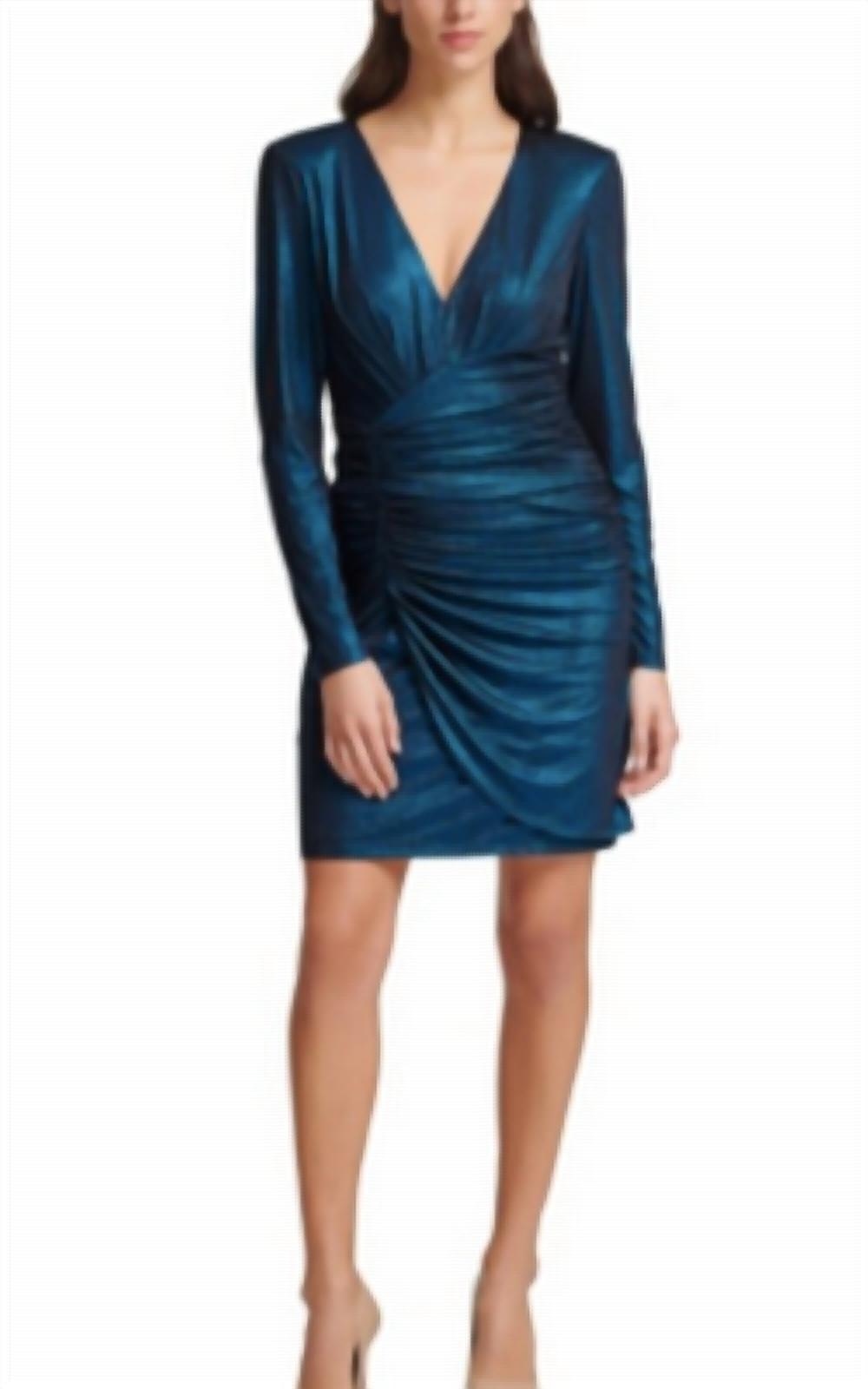 The kind of easy and flattering dress you'll be reaching for all season long. Vince Camuto long sleeve metallic dress with ruching. Bodycon