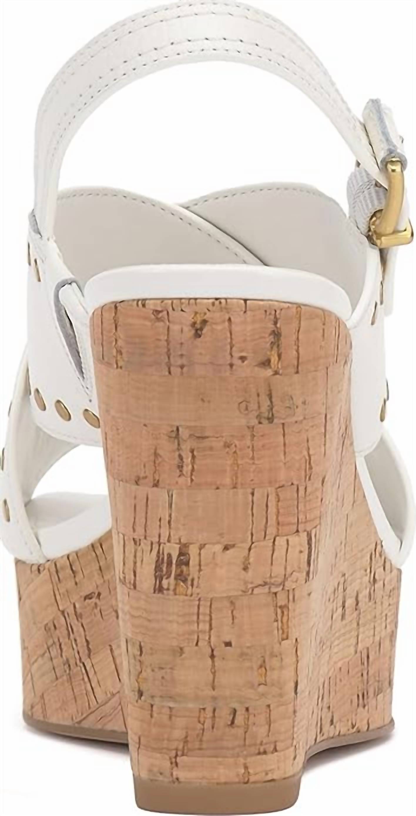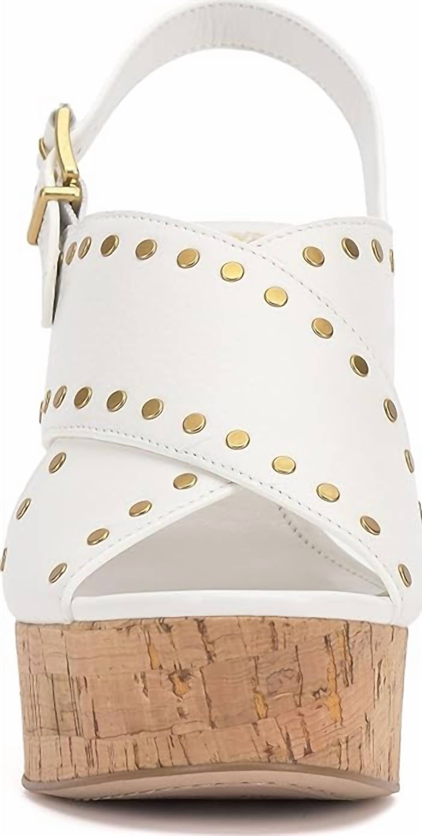 This sandal will take you from brunch to dinner and everything in between. Step out in style with the Women's Ellna Cross Band Studded Platform Wedge Sandal by Vince Camuto. This elegant sandal boasts a striking 4.1" wedge heel in the sophisticated Bianco shade, perfect for any evening event. Designed with an open toe and medium footbed width, it ensures comfort without compromising chic summer style. Embrace the quiet luxury trend, effortlessly elevating your look.