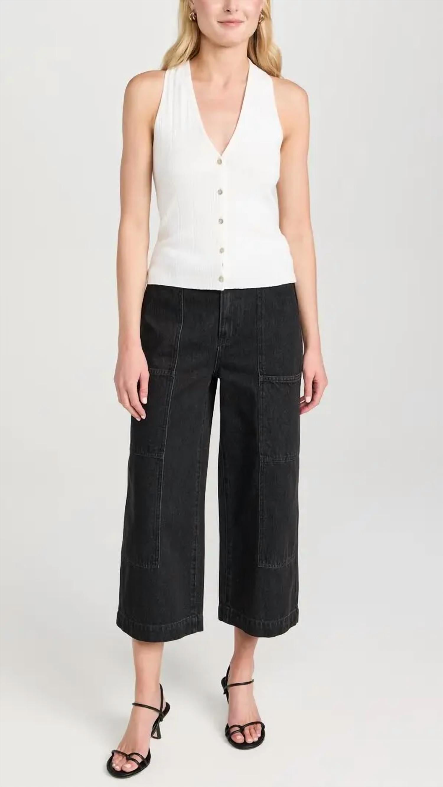 The perfect cropped jean for those transitional seasons. Step into style with the Vince Midrise Utility Crop Wide Pant in Washed Black, crafted for the modern minimalist. Designed with a relaxed fit and wide leg style, these pants feature a mid-rise with an 11.5-inch rise and a 24-inch inseam. The non-stretch fabric is made from 100% cotton, offering both comfort and durability, while practical details include slant hip pockets and patch front and back pockets. Closure is handled by a hook-and-eye at the waist with a zip fly, and care instructions recommend machine washing with cold water and tumble drying.