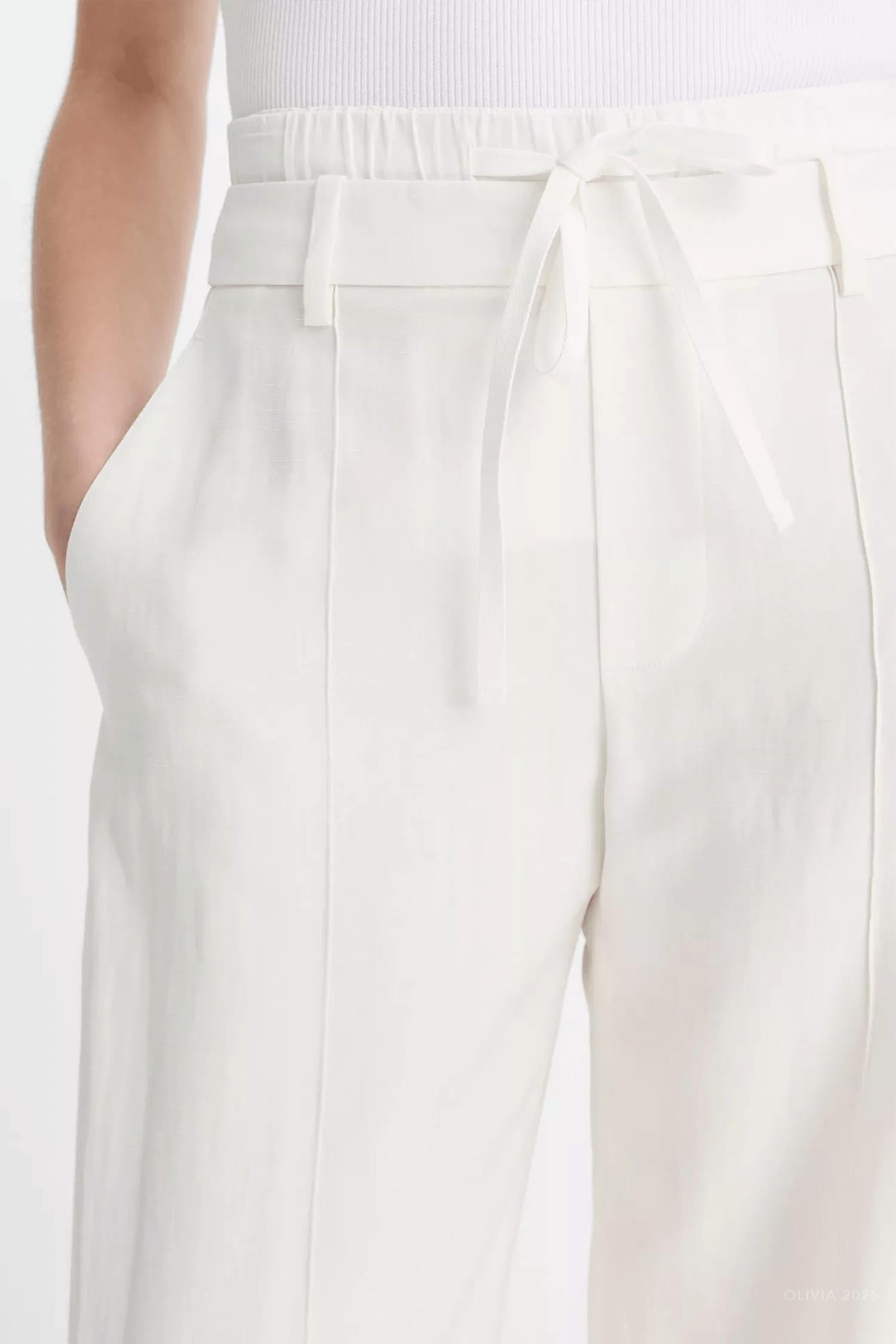 Introducing the Double-Waistband Drawstring Pant by Vince, a chic twist on the classic trouser in elegant Off-White. Featuring a relaxed fit with wide legs, these pants have a high-rise double waistband for a modern layered look, complete with an elasticized drawstring and mock fly. Composition: 54% Polyester, 28% Viscose, 18% Flax. Inseam: 32.5". Made with convenient side-seam pockets and welt back pockets, they are perfect for stylish comfort. Closure: Slip-on style with an elasticized drawstring. Care: Machine wash cold, line dry, and cool iron if needed or dry clean. Designed to run small, consider sizing up for an ideal fit. Imported.