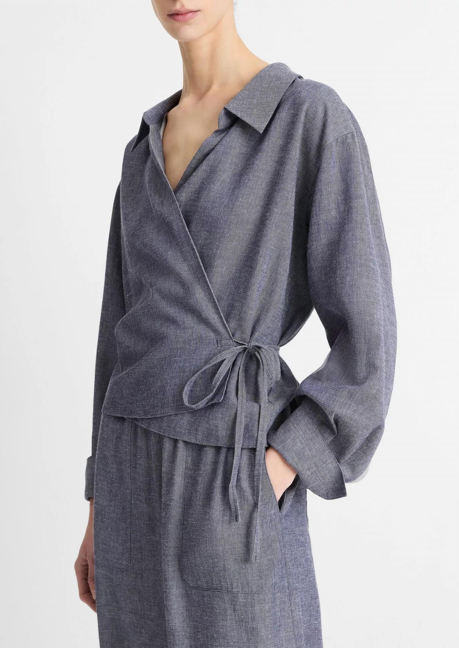 The perfect long sleeve tee that goes with just about anything. Elevate your summer style with the Women's Collared Wrap Top by Vince, designed in a versatile grey hue. This long-sleeve top is crafted from an Italian viscose-blend twill, offering a textured yet lightweight feel perfect for warm weather. It features a tie closure, single-button cuffs, and a distinctive shoulder yoke with a locker loop at the back for a tailored look. With a garment length of 23 inches, it combines breathable comfort with a chic, streetwear-inspired edge, making it ideal for vacation wear.