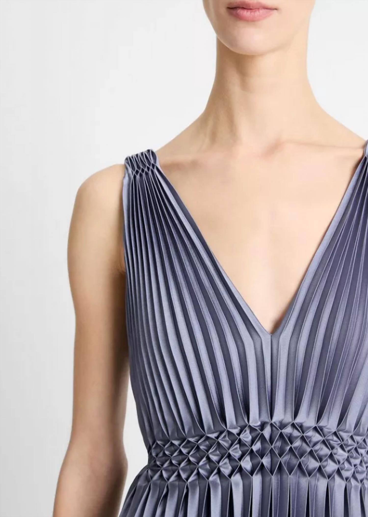 A dress you'll be reaching for season after season. Pair it with your favorite denim jacket for a more laid-back look. Enhance your wardrobe with the Hand Smocked Pleated Dress by Vince, offering a seamless blend of elegance and sophistication in Mauve Thistle. This sleeveless dress is fashioned from 100% polyester satin, featuring intricate hand-done smocking at the shoulders and waist, and completed with slender self-ties at the back. With a flattering 48.5" length, this imported A-line dress slips on effortlessly for a refined look. Care for this textured masterpiece by hand washing cold and line drying, avoiding iron and dry cleaning.