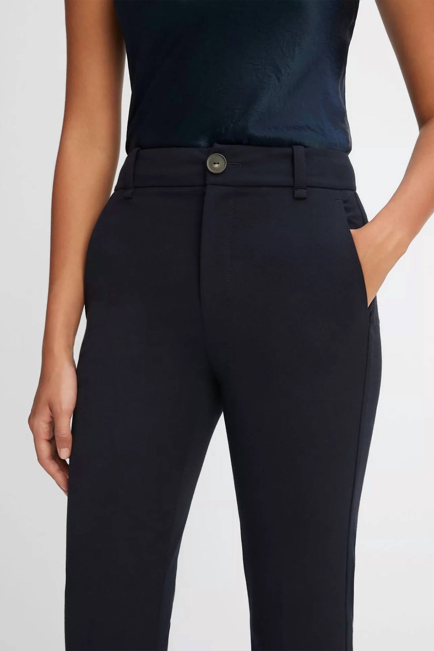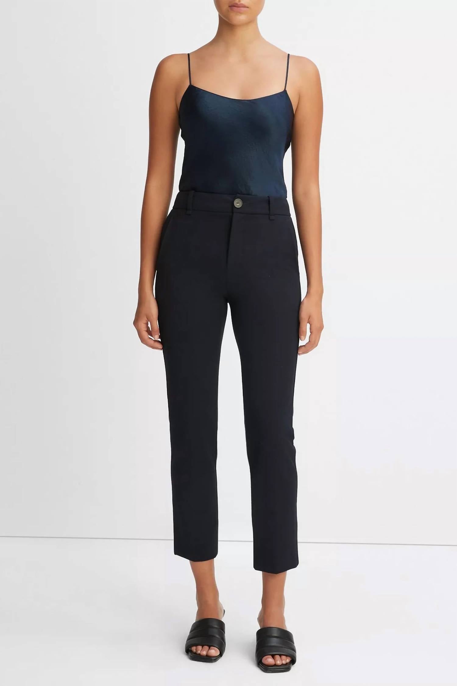 Introducing the Cigarette Trouser by Vince, meticulously crafted in a cotton blend composed of 66% cotton, 31% viscose, and 3% spandex for ultimate comfort and flexibility. This imported piece in a solid Coastal Blue color effortlessly combines style and practicality, featuring pockets for added functionality.