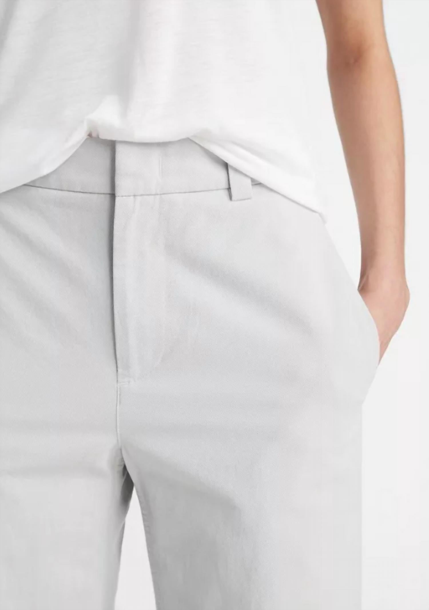 Enhance your wardrobe with this trendy cropped number, designed to blend style and practicality. The comfortable fit allows for easy all-day wear. The perfect length to pair with your favorite mules. Experience effortless style with the Low Rise Washed Cotton Crop Pants by Vince, crafted in 100% cotton for ultimate comfort and a relaxed fit. These cropped, straight-leg pants in Lunar Dust feature a high-rise waist and a classic fit that pairs perfectly with camisoles, knits, and shirting. The versatile design includes zip fly and hook-and-bar closure, quarter-top pockets, and welt back pockets. Care instructions recommend machine washing in cold water and tumble drying on low. Model wears a size 2 (5’10” height, 34” bust, 24” waist, 33” hips).