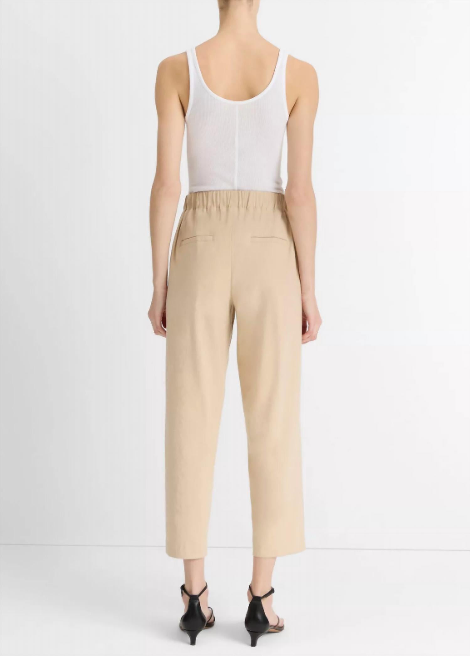 Enhance your wardrobe with this trendy cropped number, designed to blend style and practicality. The comfortable fit allows for easy all-day wear. The perfect length to pair with your favorite mules. Introducing the Vince Mid-rise Tapered Pull-on Pants in elegant Pale Nut, designed to merge refined tailoring with casual ease. These cropped trousers feature a breathable blend of 64% linen, 34% rayon, and 2% spandex, offering a relaxed fit and tapered leg for modern style. They slip on effortlessly with a mock fly and elasticized back waist, complete with classic belt loops, quarter-top pockets, and welt back pockets for functionality. Care for them with a machine wash and line dry, ensuring they remain a staple in your spring workwear collection. Inseam: 26.25", Leg opening: 16".