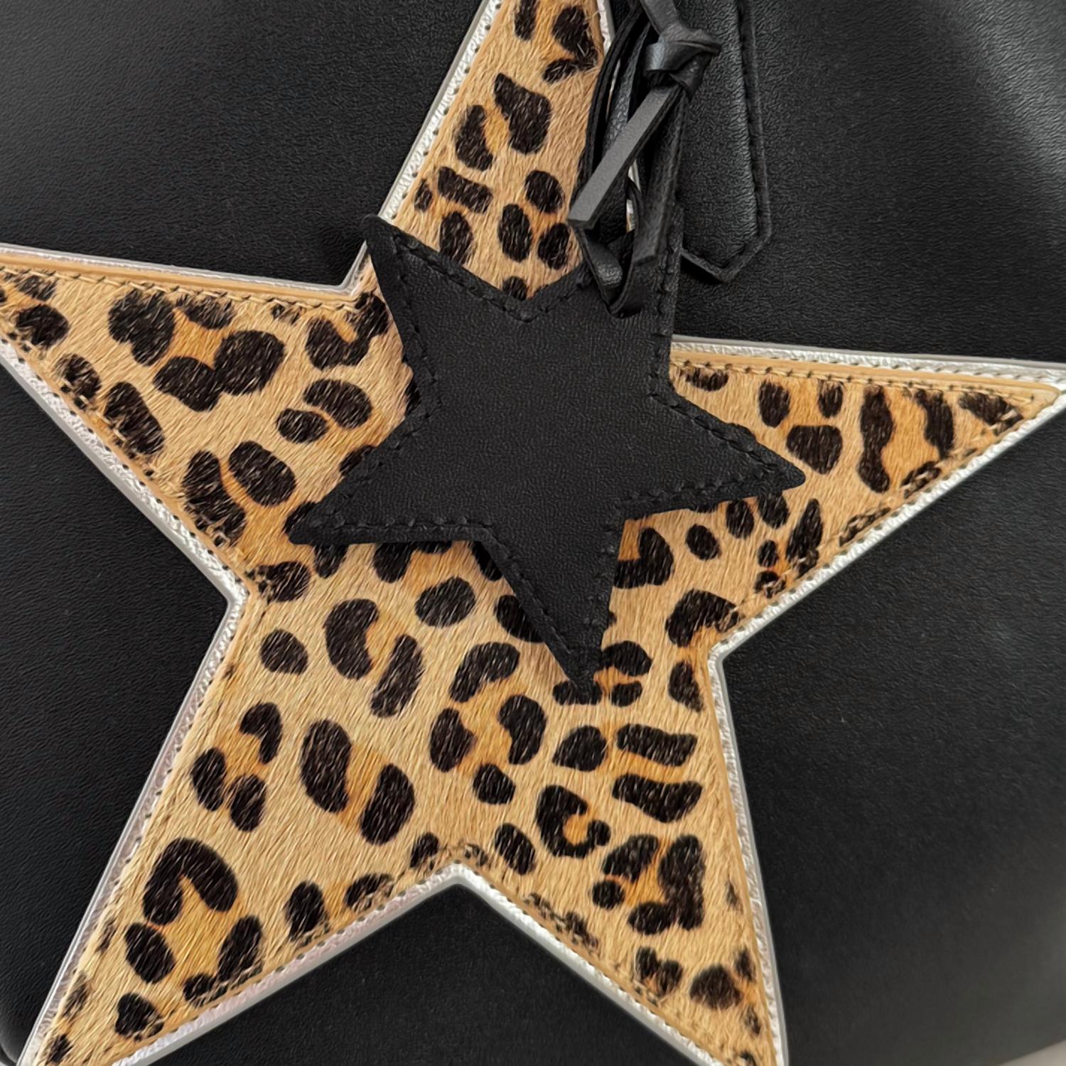 The Katie Black Leopard Star Shoulder Bag by Vintage Havana is a chic addition to any fashion-forward wardrobe. Crafted from luxurious leather, this bag showcases a striking leopard star design that elevates any outfit instantly. This stylish accessory is perfect for those looking to make a bold statement with their daily looks.