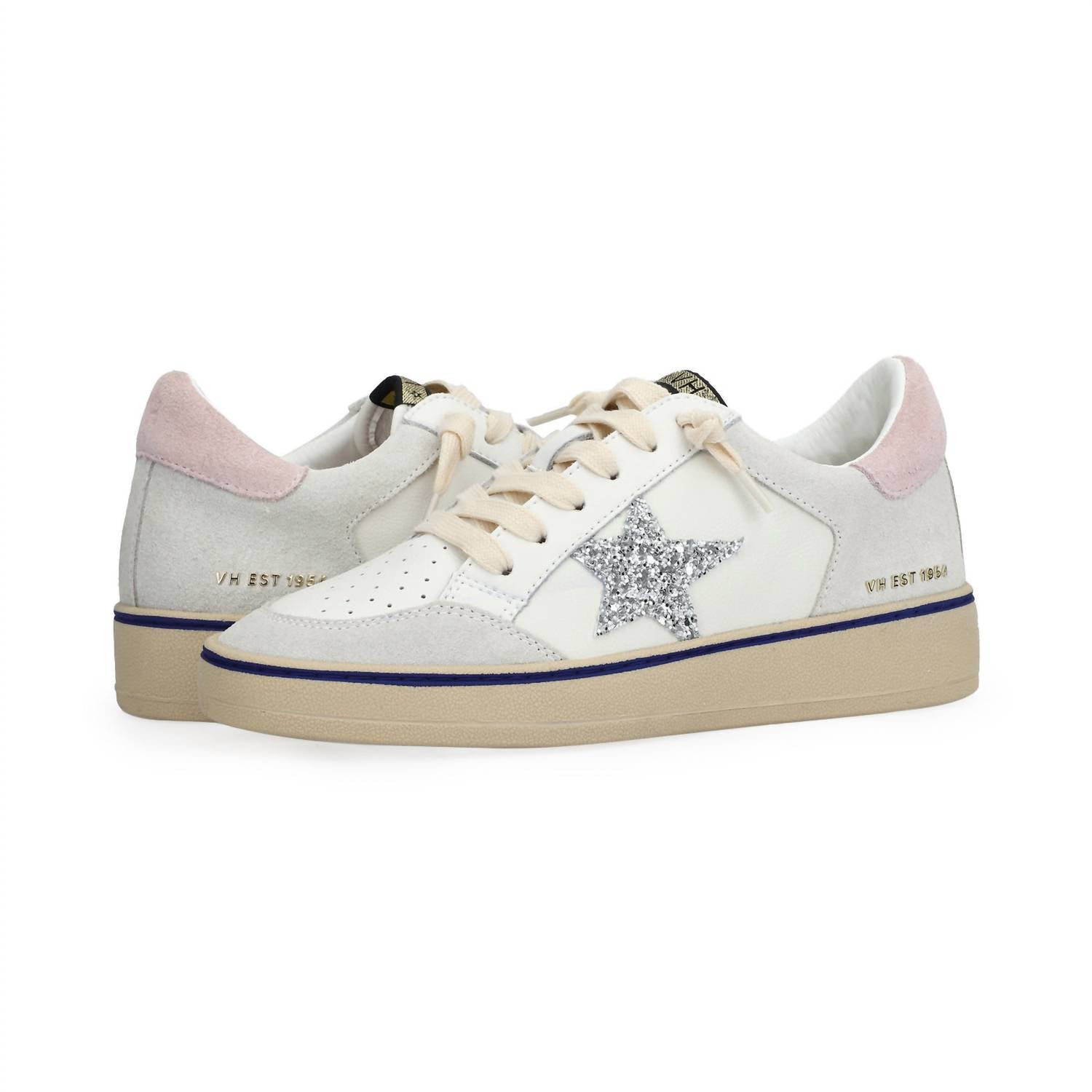 Get your daily steps in with these adorable sneakers. Step into style with the Women's Denisse Leather Sneaker by Vintage Havana, an ideal choice for summer streetwear. These sneakers offer a unique blend of synthetic, leather, and suede materials in a striking Silver Glitter/Blue Stripe colorway. Featuring convenient slip-on styling with no tie, they ensure effortless wear and comfort. Equipped with a traction signature outsole, these sneakers fit true to size and are perfect for travel and holiday outings.