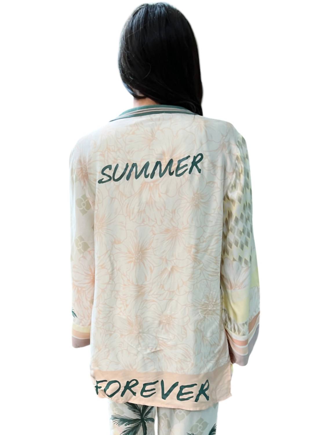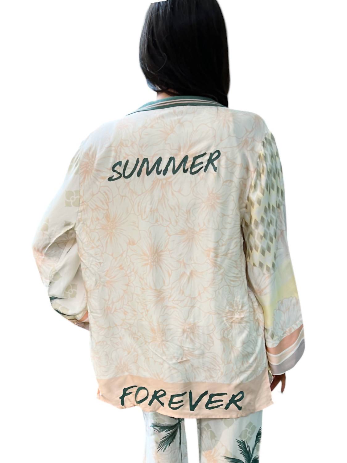 A blazer so versatile you can wear it to the office or pair it with jeans for a more casual look. Introducing the Summer Paradise Blazer by Vintage Havana, a stylish addition to your wardrobe with its playful "summer forever" back graphic. Women's patterned blazer comes in a flowy fit and features long sleeves and a classic collar. Pull-on style. Hand wash.