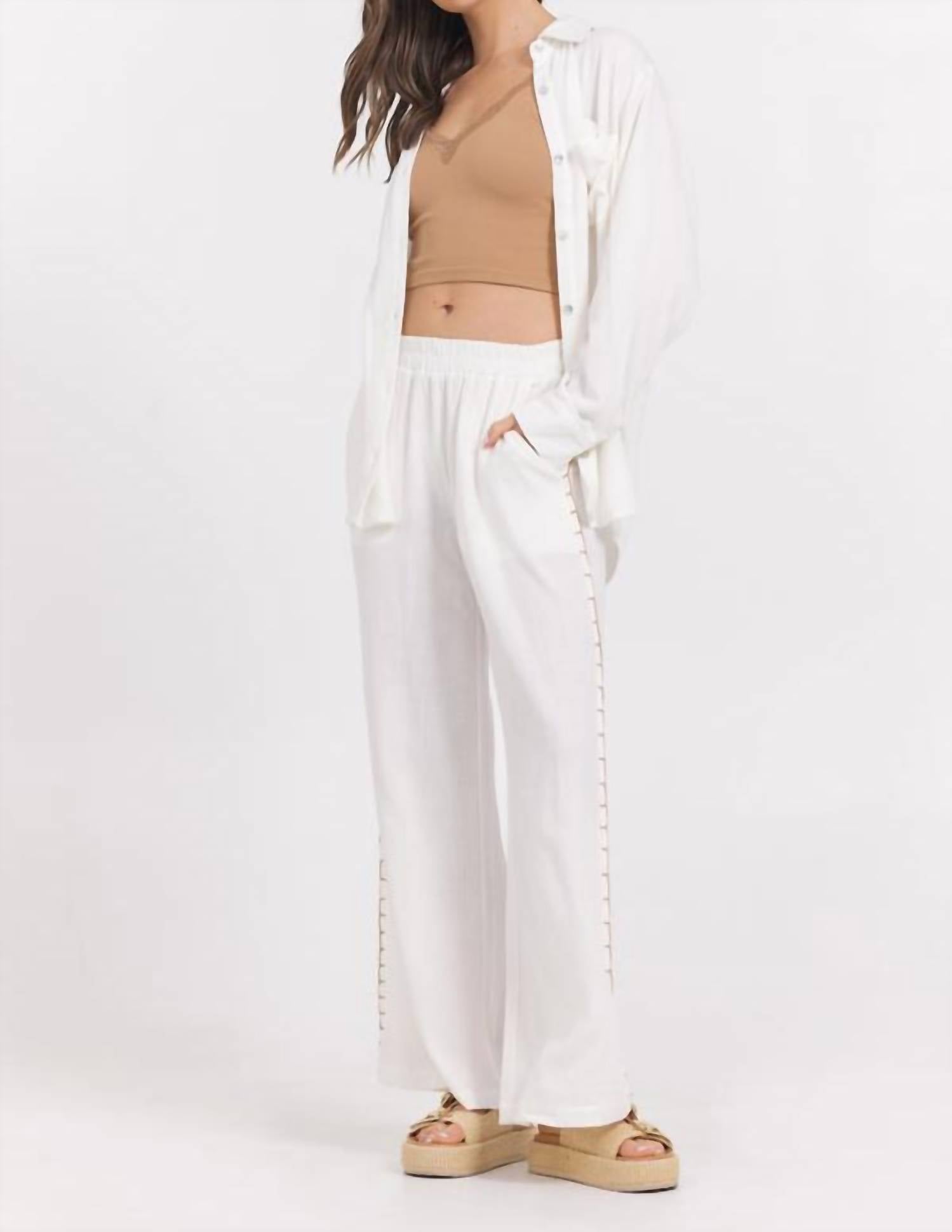 Experience unparalleled comfort with the Washed Linen Wide Leg Pants by Vintage Havana, crafted for both casual and polished occasions. Made from breathable linen in a crisp white hue, these pants feature a relaxed wide-leg style and refined whip stitch detailing along the sides. Designed with functionality in mind, they come with pockets and offer a pull-on closure for ease.