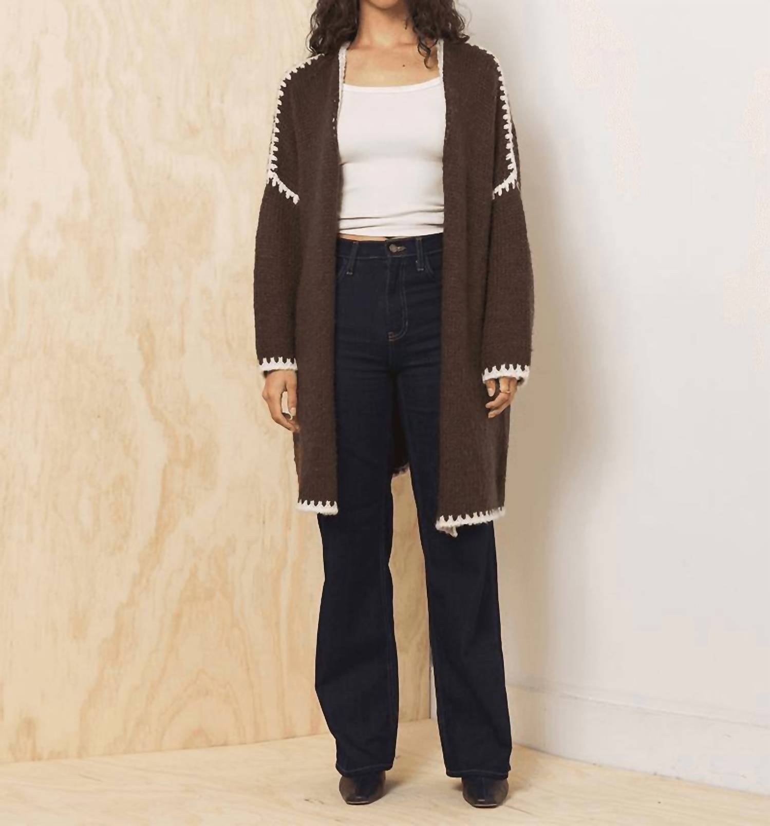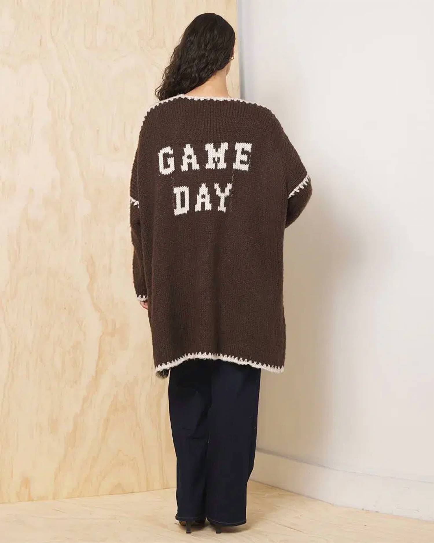 A classic fit that works just as good buttoned as it does left open. Stay cozy and stylish with the Vintage Havana Game Day Open Front Cardigan, designed for effortless charm. Featuring a long sleeve design, this relaxed-fit cardigan boasts a hand-knit intarsia pattern with bold ivory "GAME DAY" lettering against a chocolate brown base. The oversized silhouette in a soft, heavyweight knit makes it an ideal layering piece for chillier days. Closure: Pull on. Originating from Vintage Havana, it's perfect for casual weekends, tailgates, or adding a sporty touch to your holiday party wardrobe.
