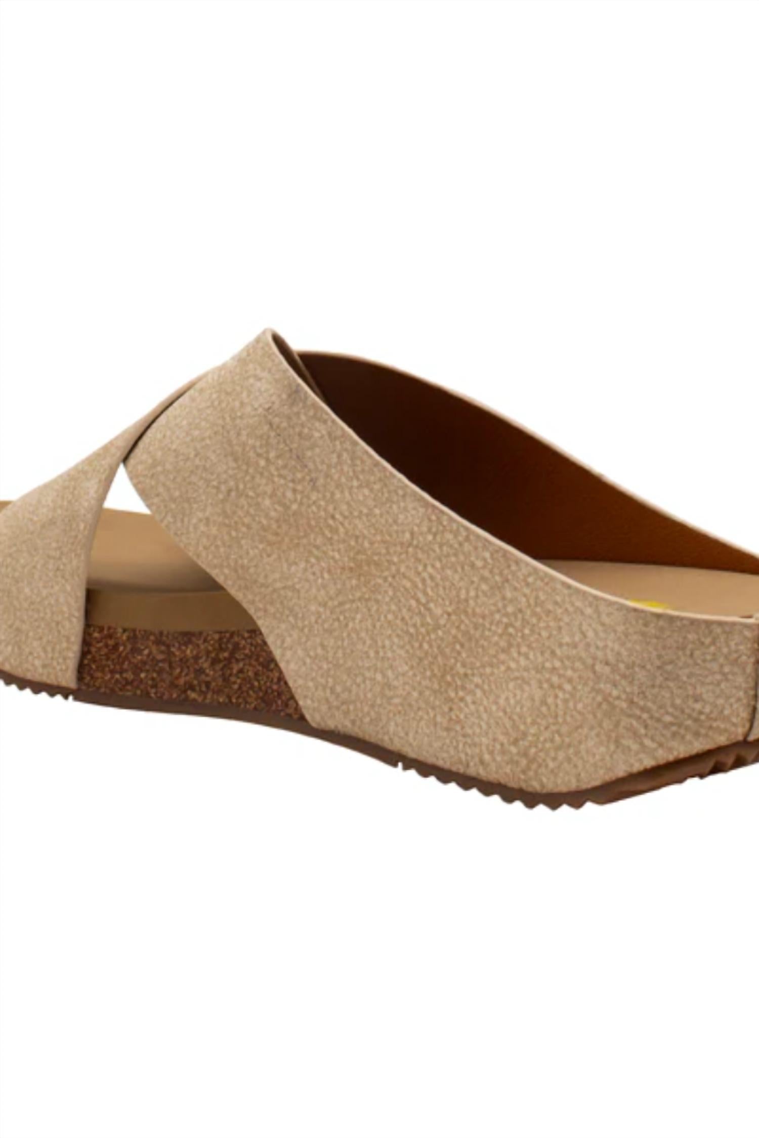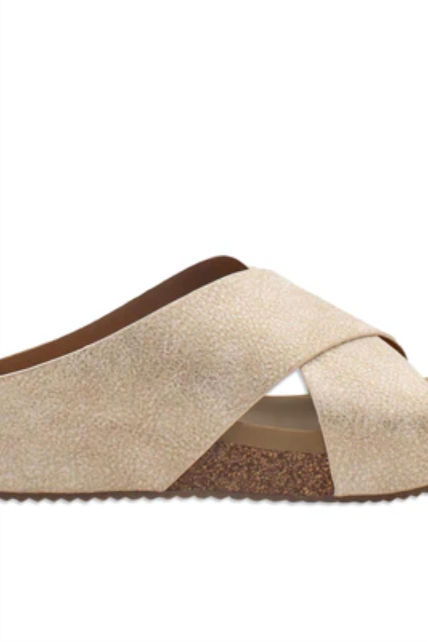 Timeless wedges that will be relevant season after season. Step into effortless style with VOLATILE's Women's Ablette Wedge Slide in chic gold. These crisscross slides boast a genuine leather upper and a convenient slip-on design that pairs seamlessly with any summer outfit. Featuring an ultra-comfortable EVA insole atop a cork-covered wedge heel measuring approximately 1.25 inches, these sandals are perfect for vacation excursions or summer gatherings. The round toe shape and rubber traction outsole ensure a secure and fashionable fit, embodying both sophistication and versatile comfort.