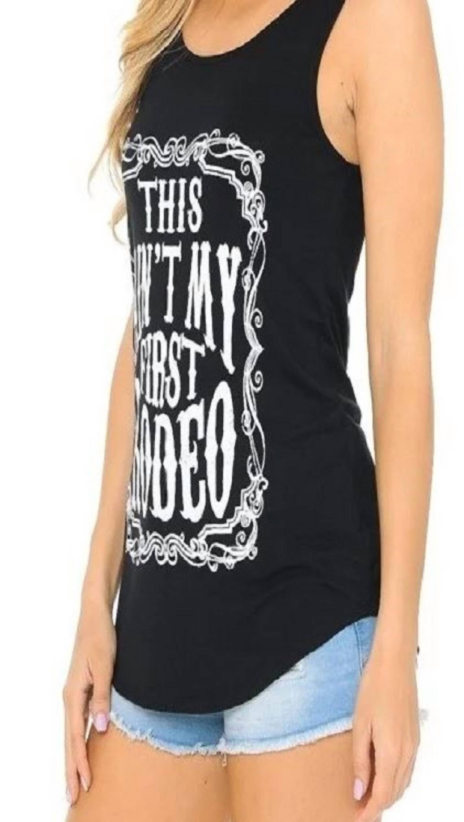 Fit, fabric and functionality. This tank top checks all the boxes. Discover the Rodeo Tank Top by SJL Apparel, a western-themed graphic piece perfect for your summer streetwear collection. This black tank features a bold "This Ain't My First Rodeo" print, designed in a sleeveless style with a classic crewneck. It offers a comfortable pull-on closure, making it ideal for vacations and casual outings. Easy to care for, this top is machine washable and can be tumble dried.