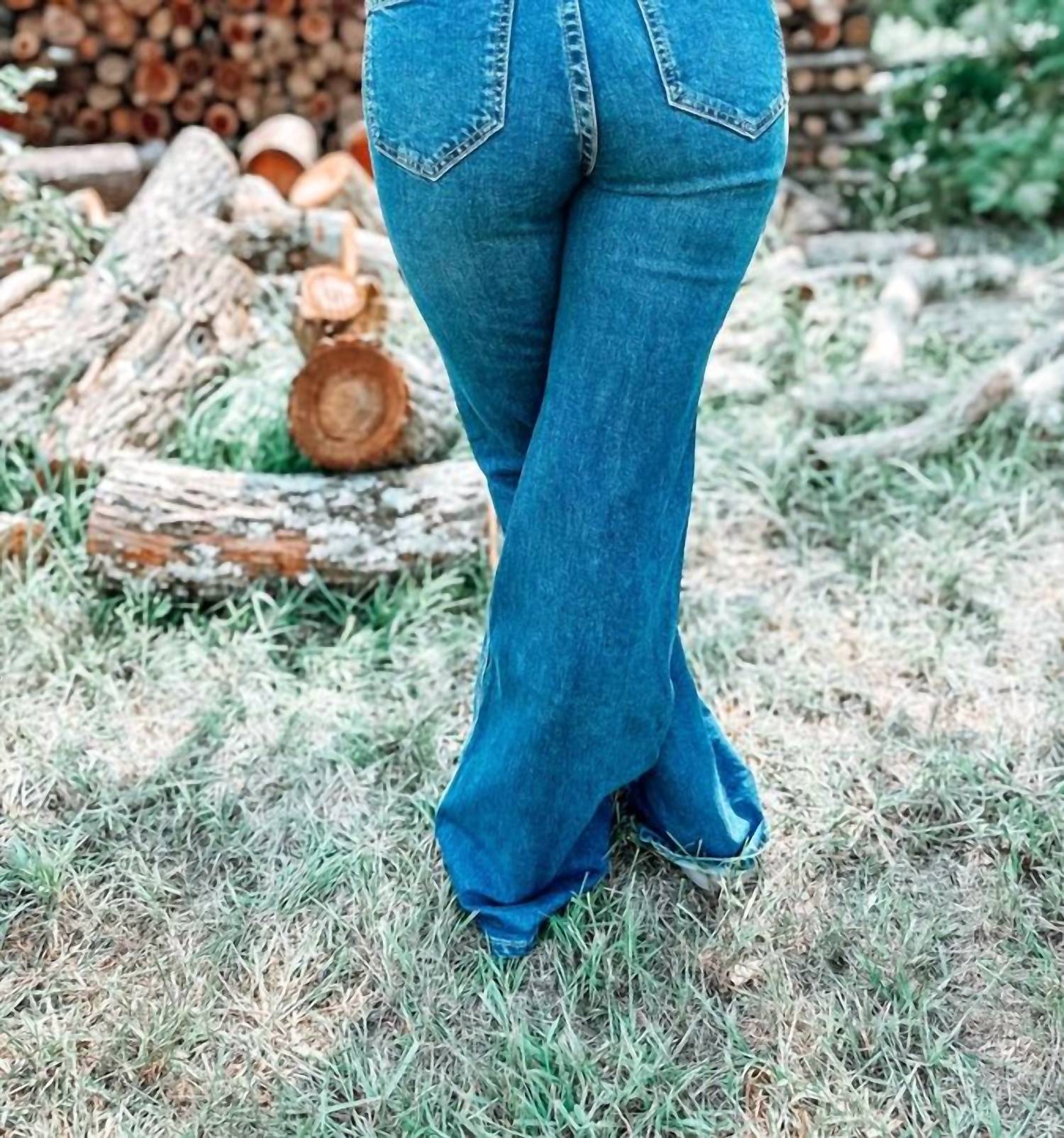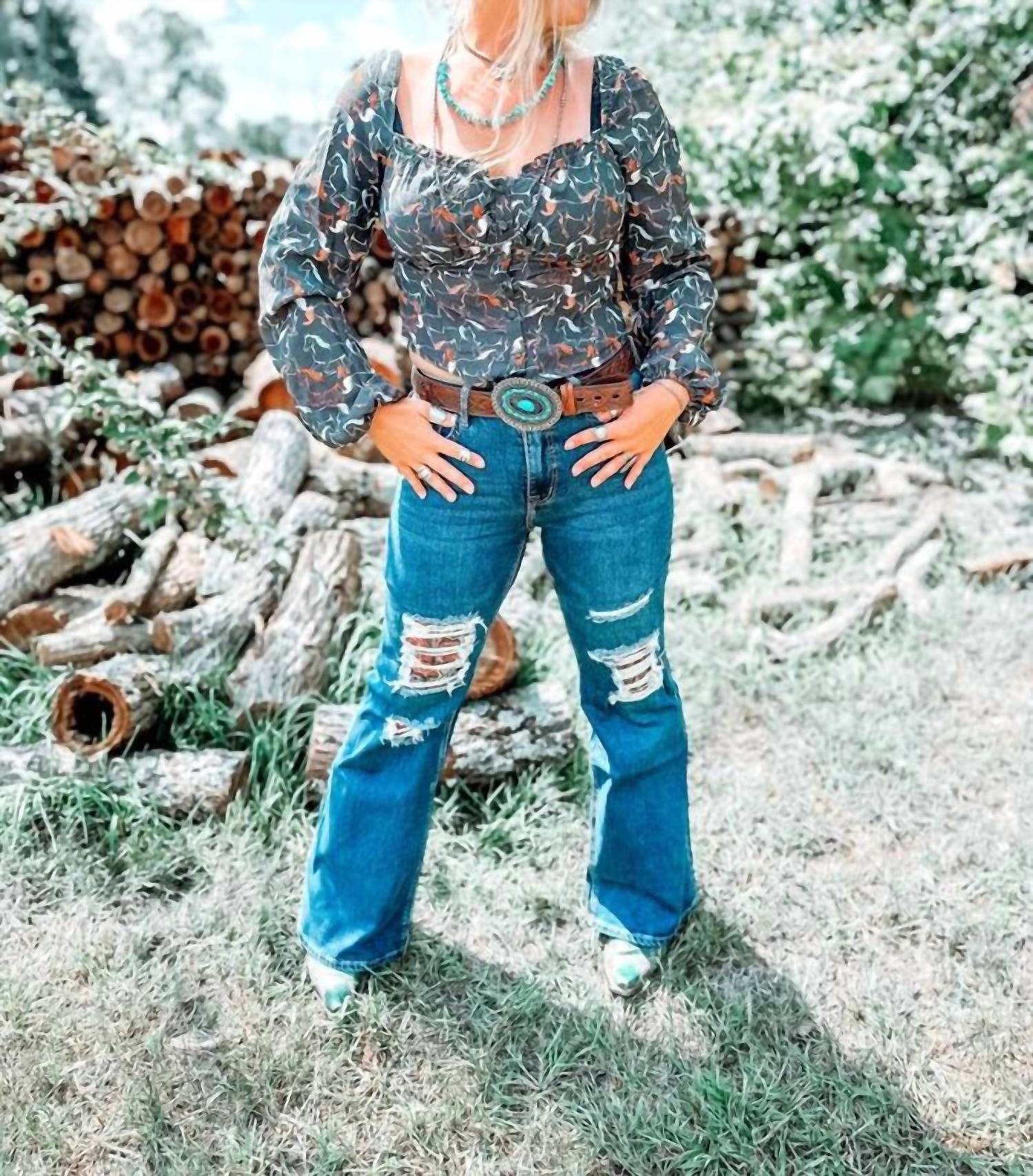 A flattering silhouette that's suprisingly versatile. Introducing the Autumn Aztec Flare by Rock & Roll Cowgirl, crafted in high-quality denim with a touch of subtle stretch for a superb fit. These women's flared leg jeans feature a mid-rise waist and a 36-inch inseam, perfectly capturing grunge and festival vibes. Closure is via a convenient side zipper, complemented by a stylishly distressed look with a canvas patch background. Care is effortless: simply machine wash and tumble dry.
