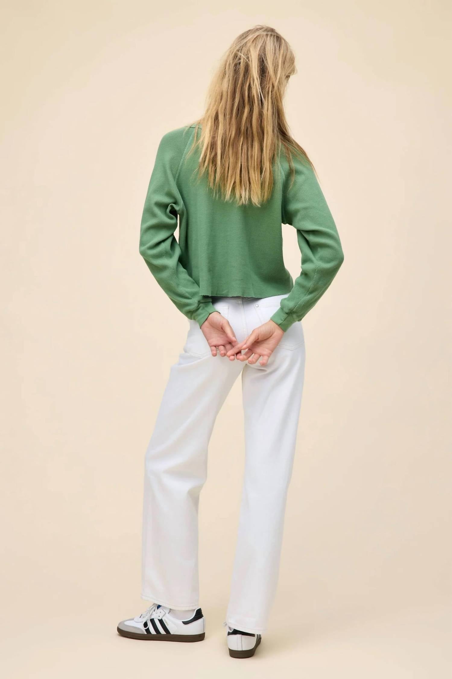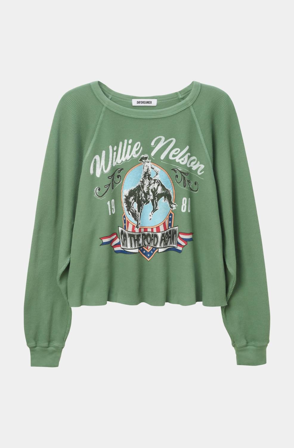 Whether you're running around town or lounging at home, this sweatshirt works for both. Embrace a Western-inspired look with the Willie Nelson 1980 Cowboy Raglan Thermal Sweatshirt by DAYDREAMER. This stone green sweatshirt features long sleeves and is crafted completely from 100% Cotton, ensuring a midweight thermal texture. Made in the USA, it’s a pull-on style with distinctive reverse raglan seam details and a raw cut hem. For care, simply hand wash this graphic piece that perfectly suits a holiday party occasion. Model wears size S.