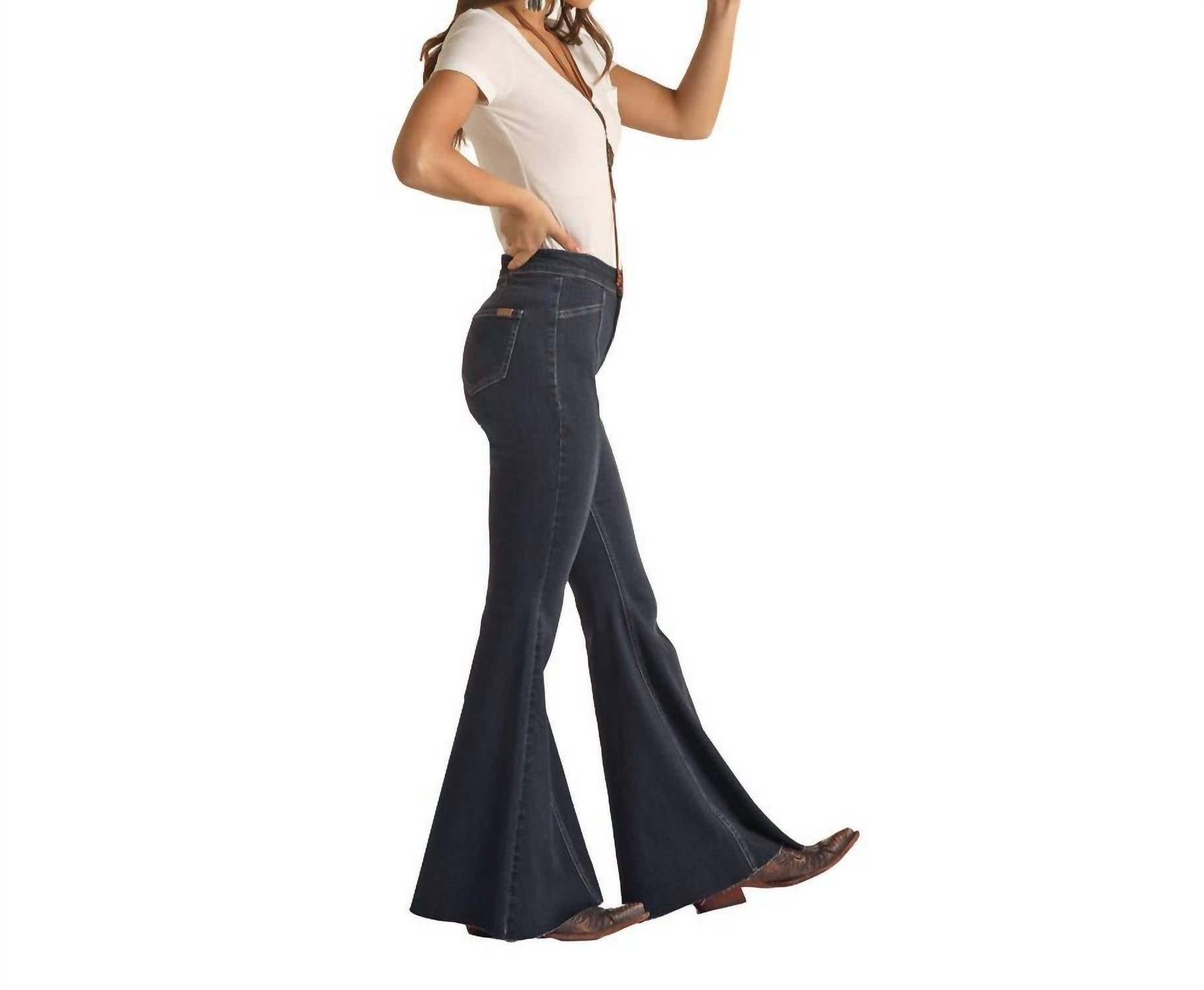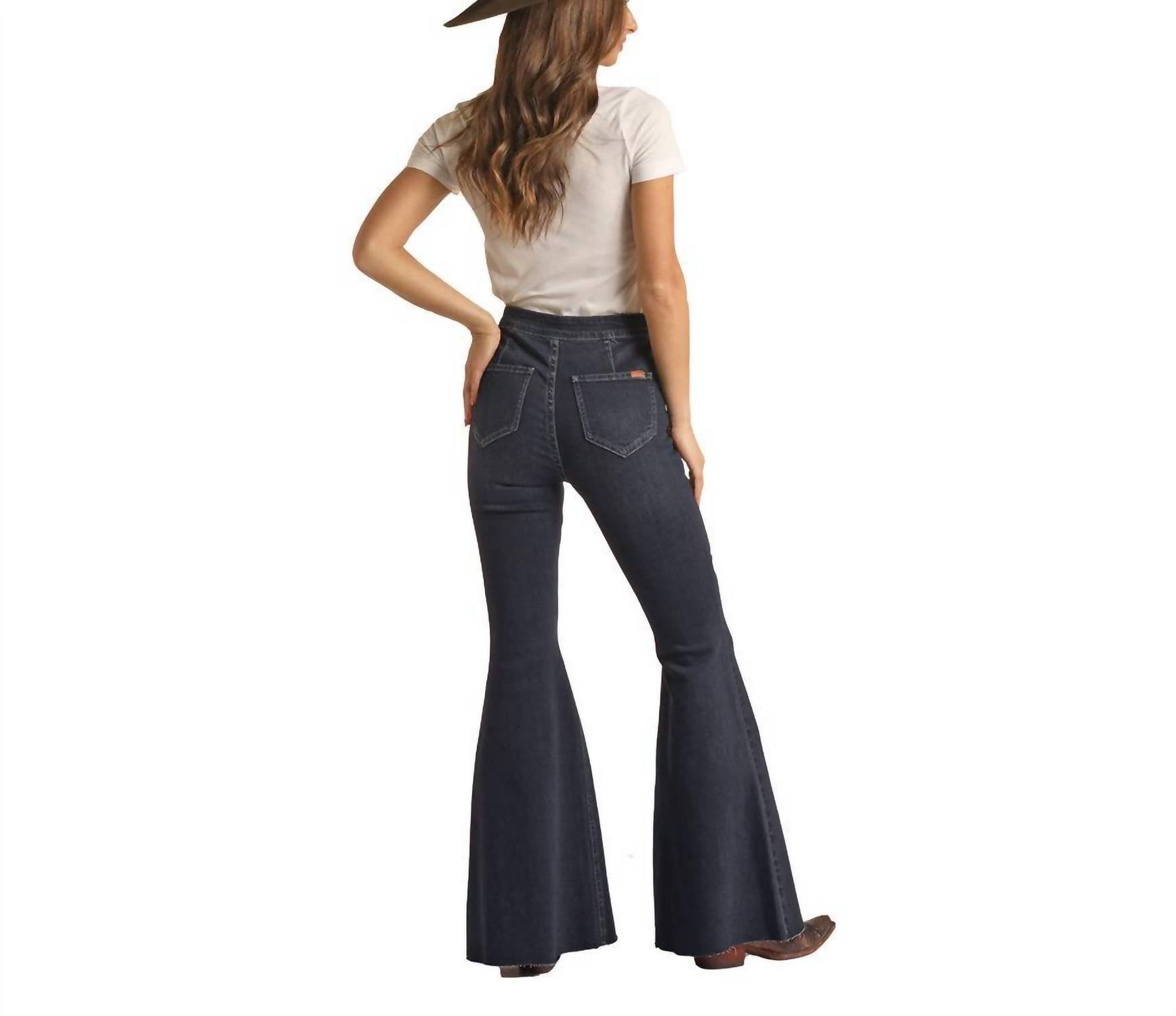 Rock & Roll Cowgirl Front Seam Button Stretch Jean - Dark Wash. Frayed bottoms! Need them shorter? Easy to just cut off! Bell bottom. Raw hem. 92.5% cotton, 6% polyester, 1.5% spandex.