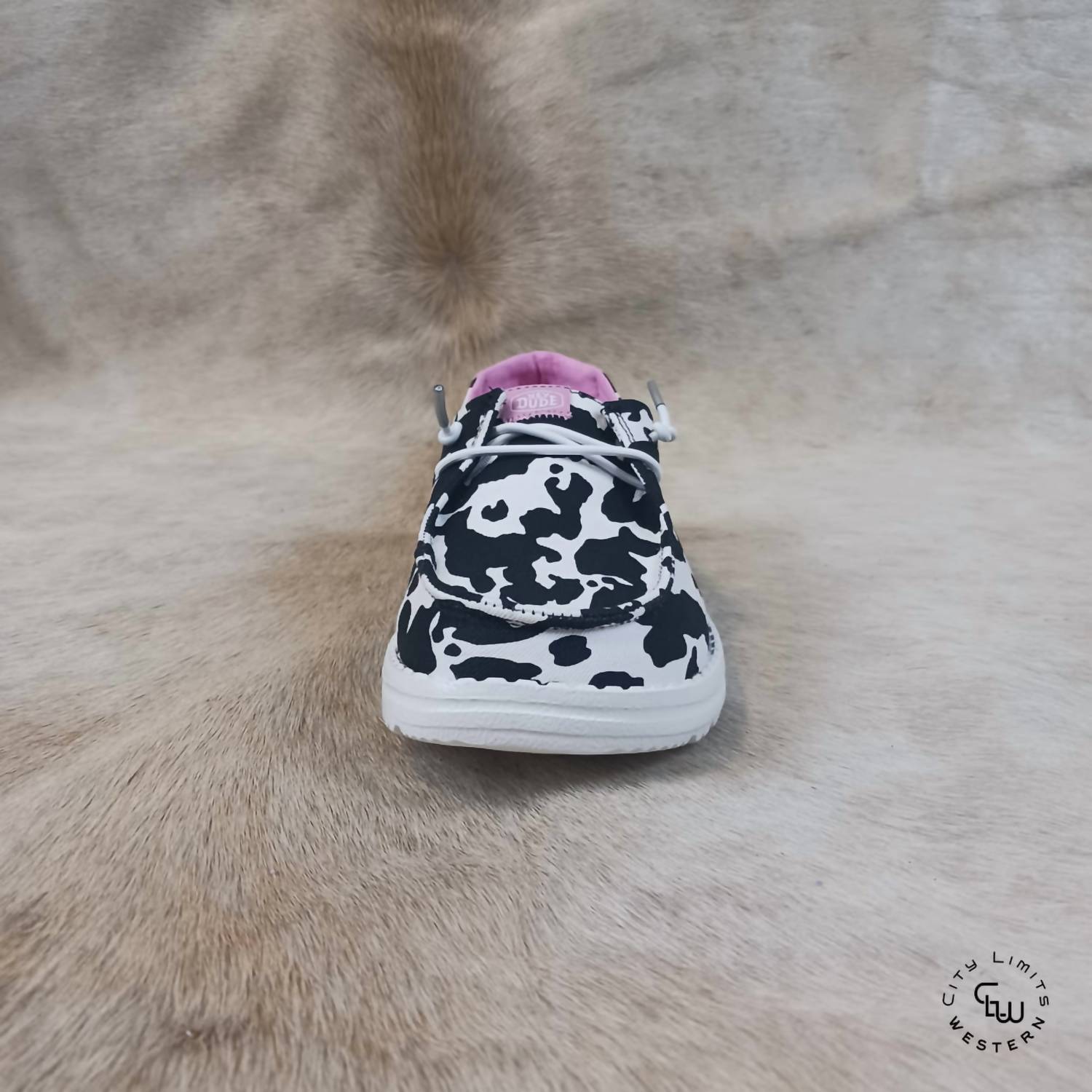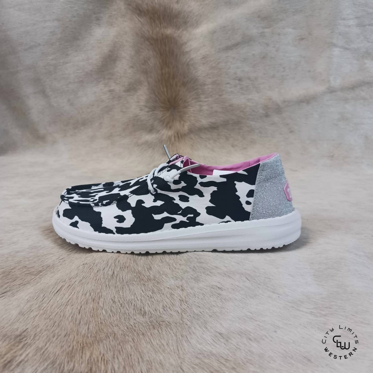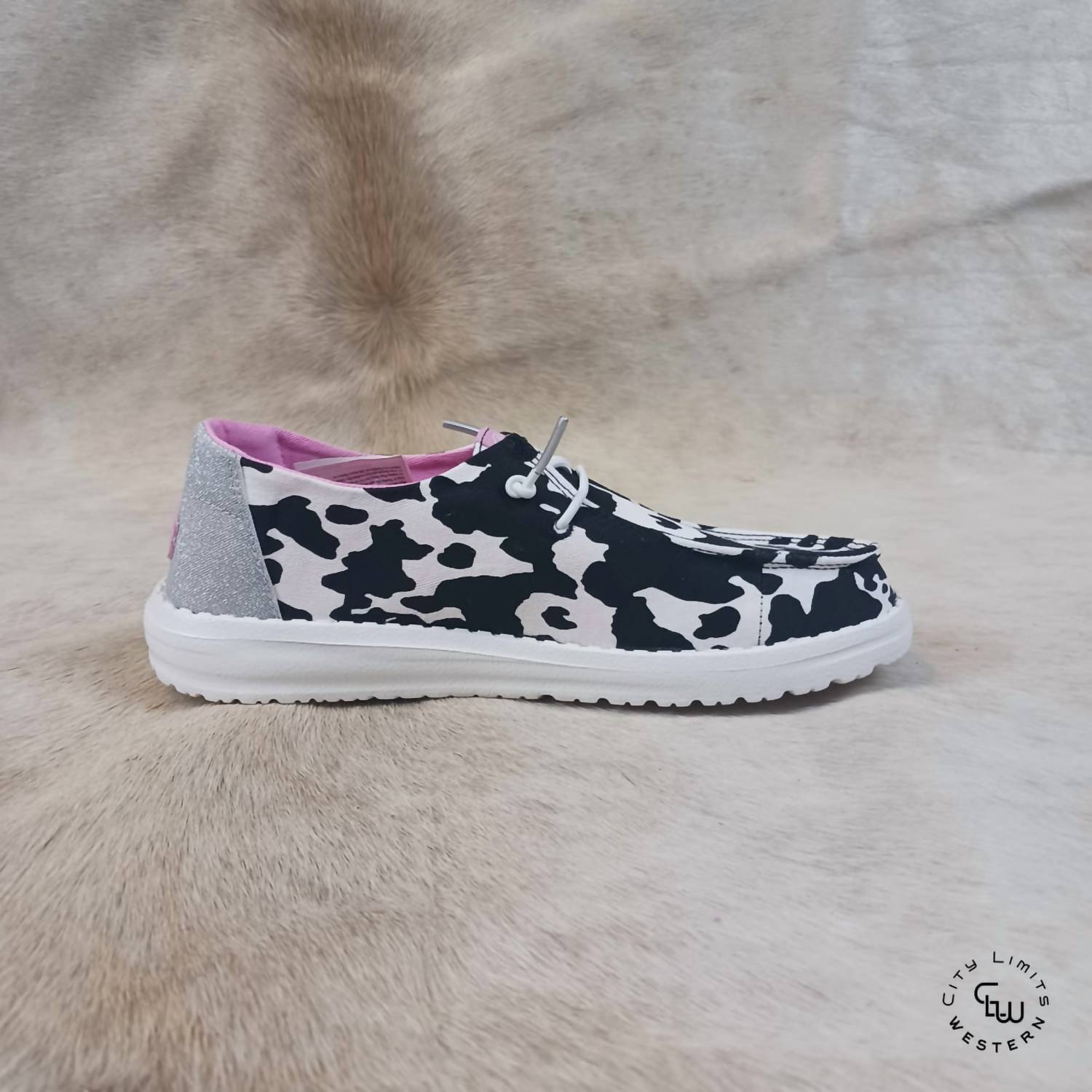 The Kid's Wendy Cowgirl Sparkle by HEY DUDE is the perfect pick for a dinner party, with its stylish flat heel and round toe design. These black and white sneakers are ideal for little girls looking to add some sparkle to their summer wardrobe. Crafted without specific country of origin details, they're designed for comfort and style. Whether for a casual outing or a more formal setting, these sneakers captivate with their unique sparkle detail.