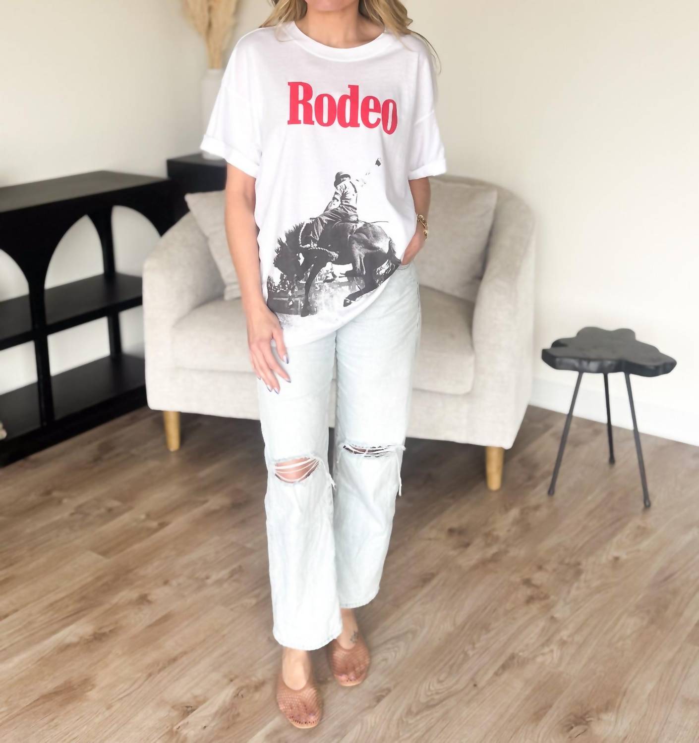 This classic, short sleeve tee will be your go-to staple this season and beyond. Introducing the Girl Dangerous Wren Rodeo Graphic Tee, a bold statement piece for your casual summer style. This oversized white tee features short sleeves and a striking black and white bucking bronc graphic with red accents, perfect for adding a rodeo-inspired touch to any look. Designed with a classic crewneck and a convenient pull-on closure for easy wear. Shaina is wearing a size small, showcasing its comfortable and roomy fit.