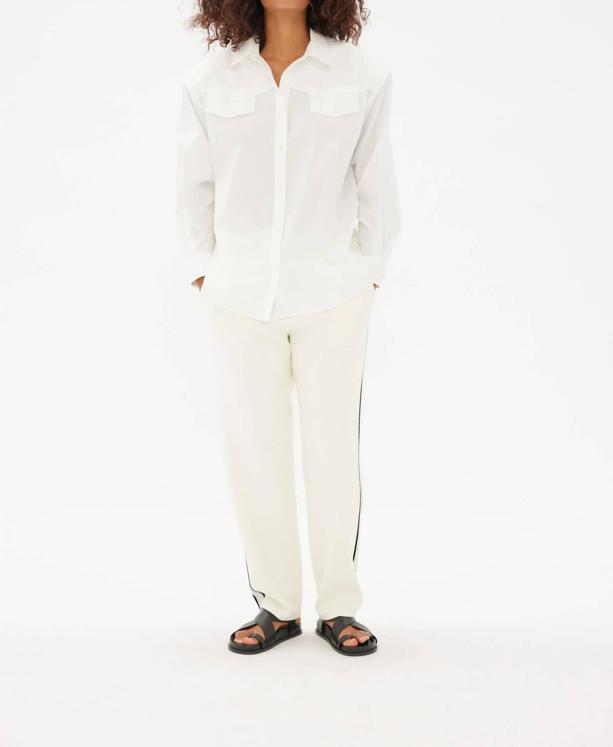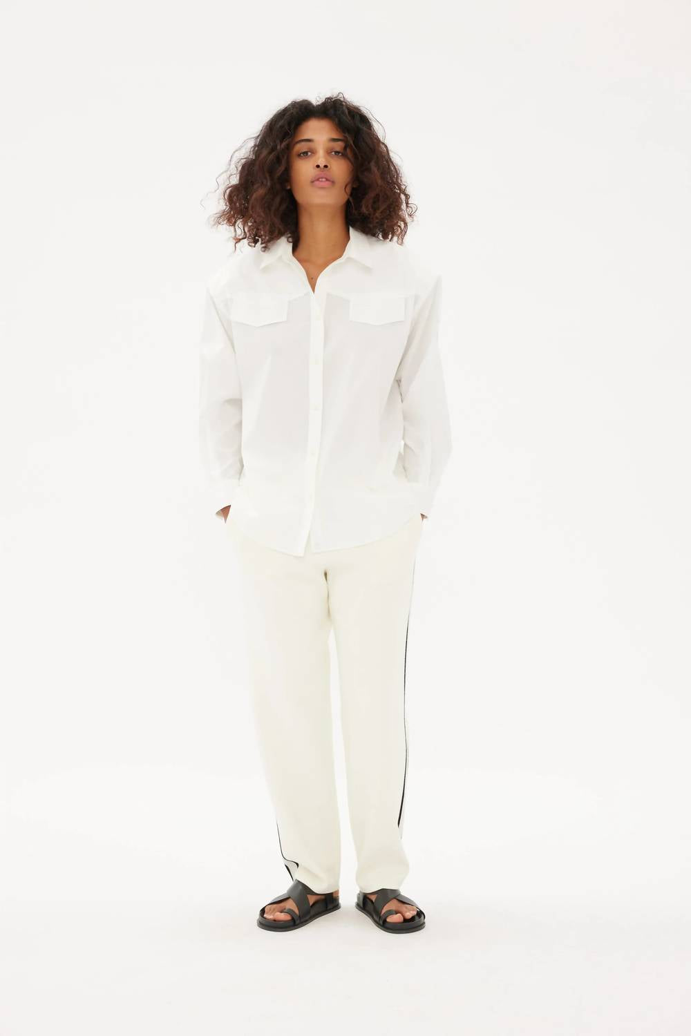 Perfectly tailored and soft to the touch. Introducing the LMND Rodeo Shirt, a chic addition to your wardrobe that's as comfortable as it is stylish. Featuring long sleeves and crafted from 100% cotton poplin, this white shirt is perfect for any casual daytime look. It boasts a classic button closure and a practical pocket, combining functionality with timeless design. With its solid pattern and collar neckline, this button-down shirt stands out in simplicity and elegance.