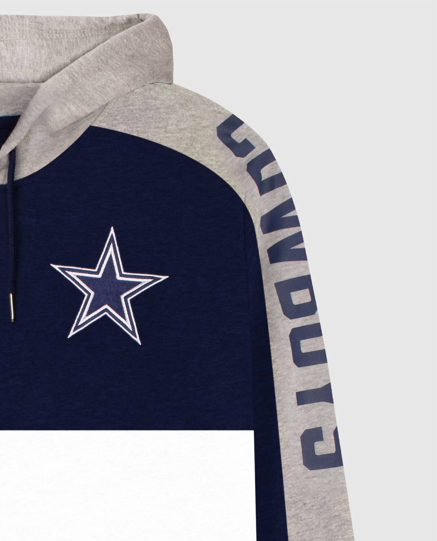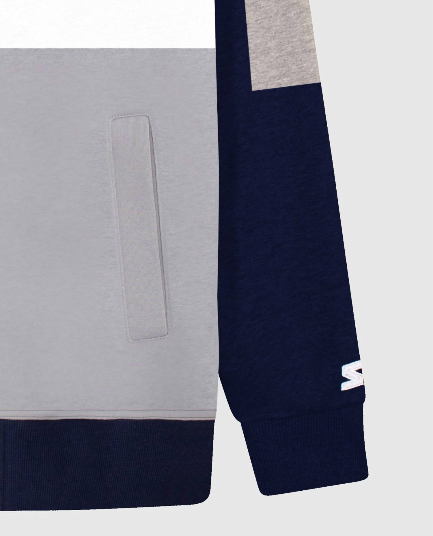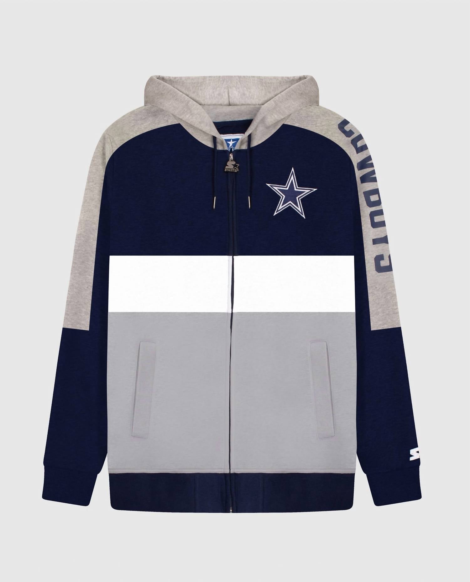 Show your Dallas Cowboys pride with the Men's Dallas Cowboys Zip-front Colorblock Starter Hoodie. Crafted by Starter, this navy hoodie showcases long sleeves in primary and secondary team colors with a distinctive color-blocked design. The garment features a convenient zip closure and front pockets, complemented by a hooded neckline with adjustable drawstrings. Decorated with a bold team logo applique on the chest and team name printed on the left sleeve, it is a must-have for every fan.